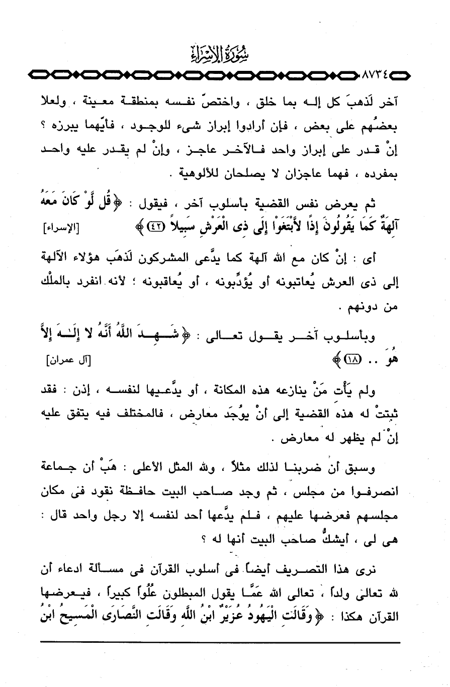 آخر لَذهبَ كل إله بما خلق، واختصّ نفسه بمنطقة معينة، ولعلا بعضُهم على بعض، فإن أرادوا إبراز شيء للوجود، فأيّهما يبرزه؟ إنْ قدر على إبراز واحد فالآخر عاجز، وإنْ لم يقدر عليه واحد بمفرده، فهما عاجزان لا يصلحان للألوهية.