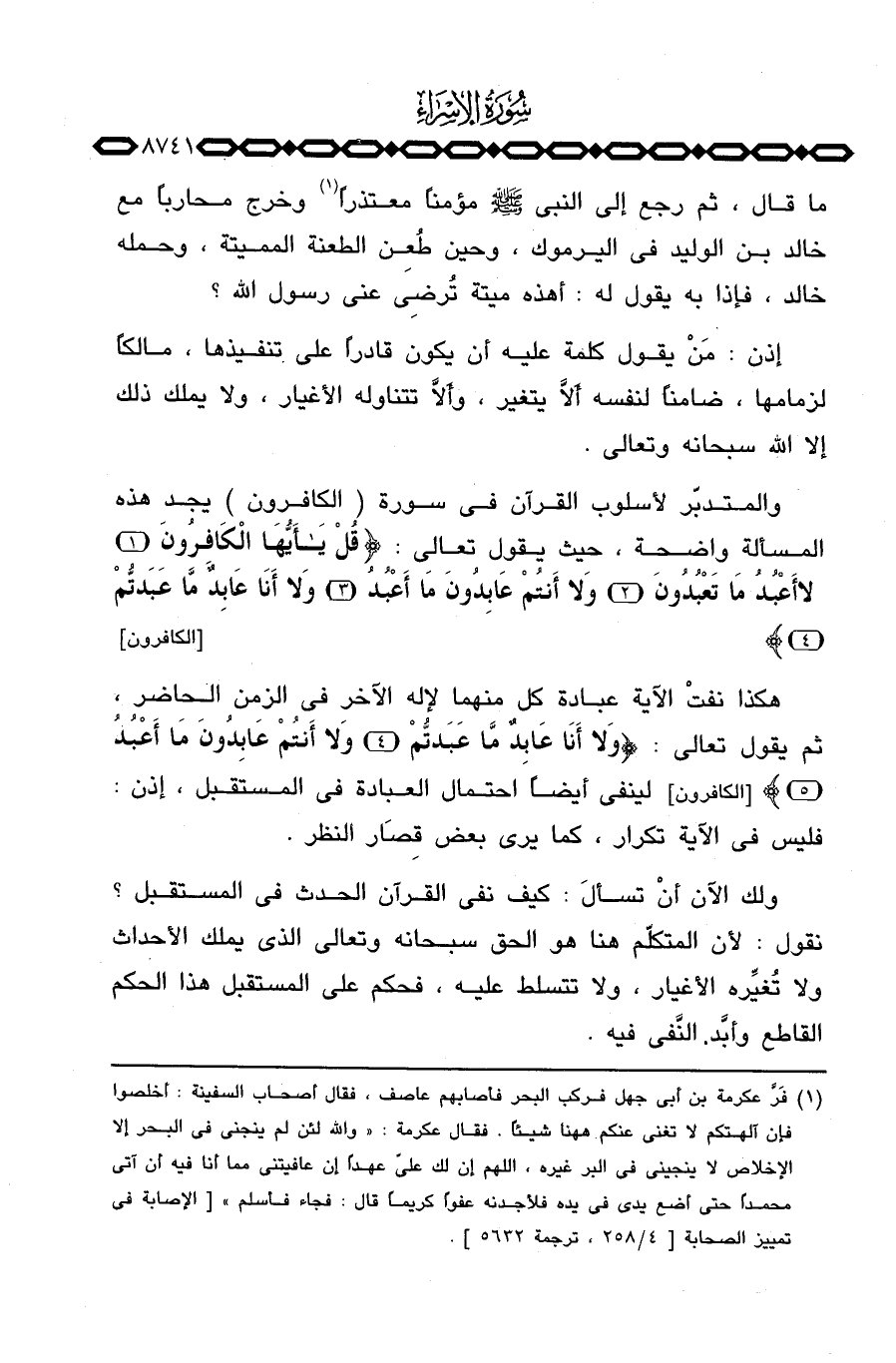 هكذا نفتْ الآية عبادة كل منهما لإله الآخر في الزمن الحاضر، ثم يقول تعالى: {وَلاَ أَنَآ عَابِدٌ مَّا عَبَدتُّمْ وَلاَ أَنتُمْ عَابِدُونَ مَآ أَعْبُدُ} [الكافرون: 4 - 5] لينفي أيضاً احتمال العبادة في المستقبل، إذن: فليس في الآية تكرار، كما يرى بعض قِصَار النظر.