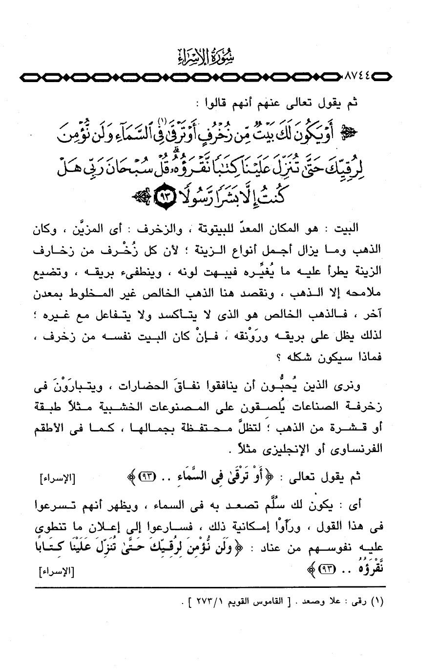 أي: يكون لك سُلَّم تصعد به في السماء، ويظهر أنهم تسرعوا في هذا القول، ورَأَوْا إمكانية ذلك، فسارعوا إلى إعلان ما تنطوي عليه نفوسهم من عناد: {وَلَن نُّؤْمِنَ لِرُقِيِّكَ حَتَّى تُنَزِّلَ عَلَيْنَا كِتَاباً نَّقْرَؤُهُ. .} [الإسراء: 93]