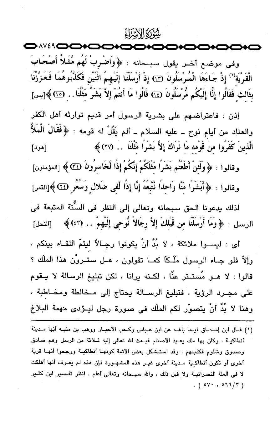 وفي موضع آخر يقول سبحانه: {واضرب لَهُمْ مَّثَلاً أَصْحَابَ القرية إِذْ جَآءَهَا المرسلون إِذْ أَرْسَلْنَآ إِلَيْهِمُ اثنين فَكَذَّبُوهُمَا فَعَزَّزْنَا بِثَالِثٍ فقالوا إِنَّآ إِلَيْكُمْ مُّرْسَلُونَ قَالُواْ مَآ أَنتُمْ إِلاَّ بَشَرٌ مِّثْلُنَا وَمَآ أَنَزلَ الرحمن مِن شَيْءٍ إِنْ أَنتُمْ إِلاَّ تَكْذِبُونَ} [يس: 13 - 15]