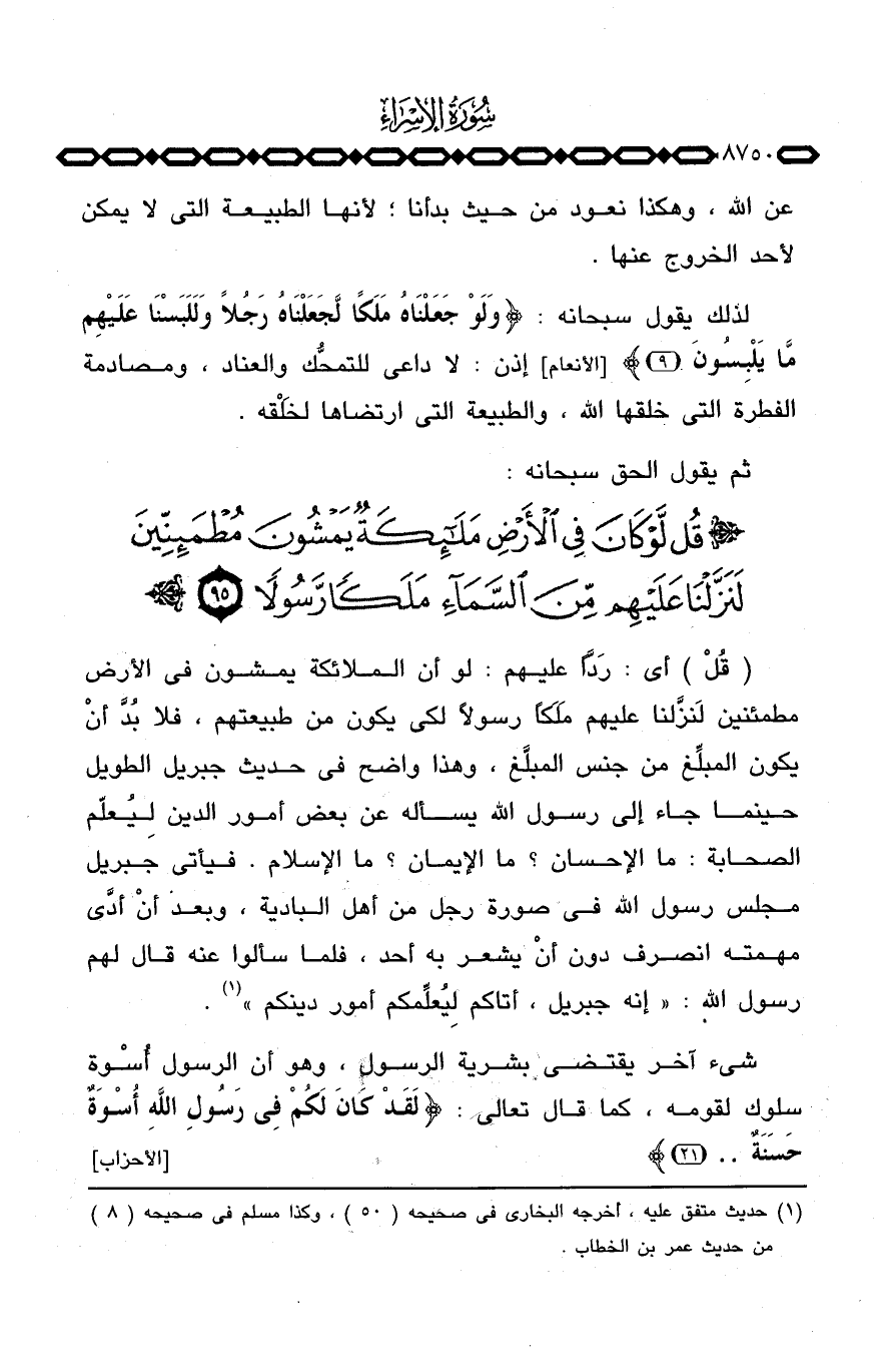 {قُلْ} أي: رَدَّاً عليهم: لو أن الملائكة يمشون في الأرض مطمئنين لَنزَّلنا عليهم مَلَكاً رسولاً لكي يكون من طبيعتهم، فلا بُدَّ أنْ يكون المبلِّغ من جنس المبلَّغ، وهذا واضح في حديث جبريل الطويل حينما جاء إلى رسول الله يسأله عن بعض أمور الدين لِيُعلم الصحابة: ما الإحسان؟ ما الإيمان؟ ما الإسلام. فيأتي جبريل مجلس رسول الله في صورة رجل من أهل البادية، وبعد أنْ أدَّى مهمته انصرف دون أنْ يشعر به أحد، فلما سألوا عنه قال لهم رسول الله: «إنه جبريل، أتاكم لِيُعلِّمكم أمور دينكم» .