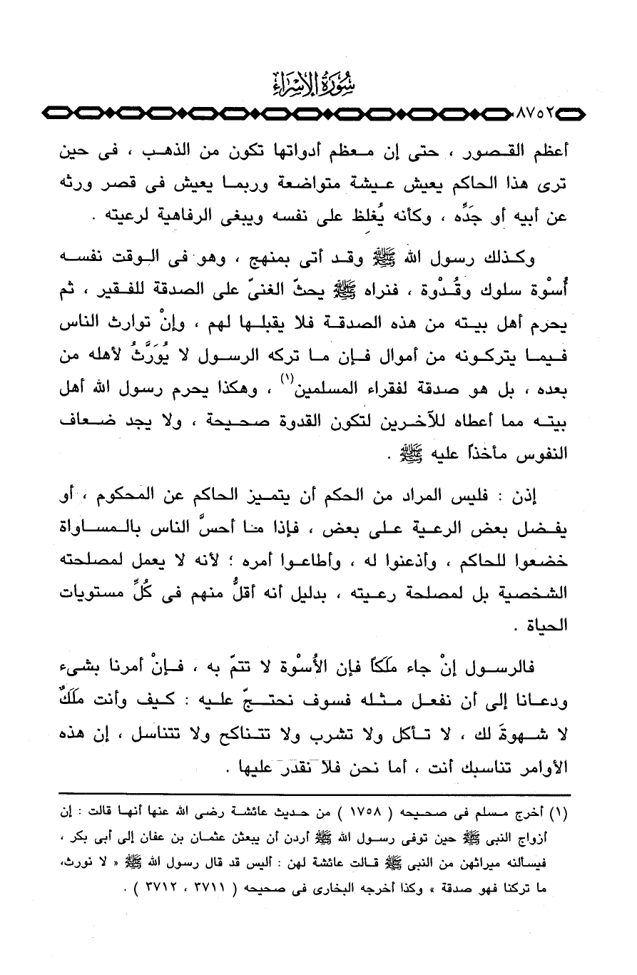 وكذلك رسول الله صَلَّى اللَّهُ عَلَيْهِ وَسَلَّم َ وقد أتى بمنهج، وهو في الوقت نفسه أُسْوة سلوك وقُدْوة، فنراه صَلَّى اللَّهُ عَلَيْهِ وَسَلَّم َ يحثّ الغنيّ على الصدقة للفقير، ثم يحرم أهل بيته من هذه الصدقة فلا يقبلها لهم، وإنْ توارث الناس فيما يتركونه من أموال فإن ما تركه الرسول لا يُوَرَّثُ لأهله من بعده، بل هو صدقة لفقراء المسلمين، وهكذا يحرم رسول الله أهل بيته مما أعطاه للآخرين لتكون القدوة صحيحة، ولا يجد ضعاف النفوس مأخذاً عليه صَلَّى اللَّهُ عَلَيْهِ وَسَلَّم َ.