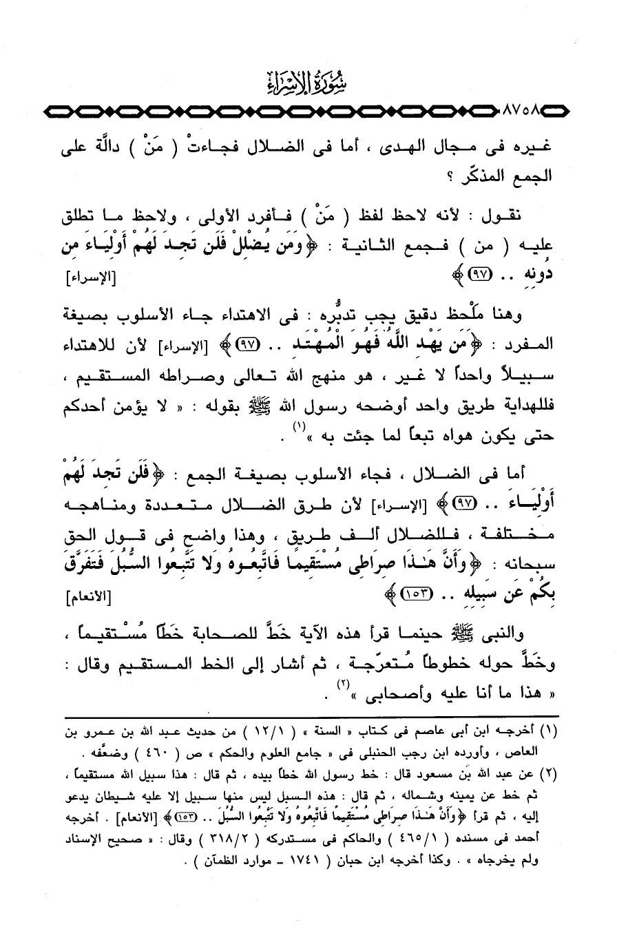 والنبي صَلَّى اللَّهُ عَلَيْهِ وَسَلَّم َ حينما قرأ هذه الآية خَطَّ للصحابة خَطّاً مُسْتقيماً، وخَطَّ حوله خطوطاً مُتعرّجة، ثم أشار إلى الخط المستقيم وقال: «هذا ما أنا عليه وأصحابي» .