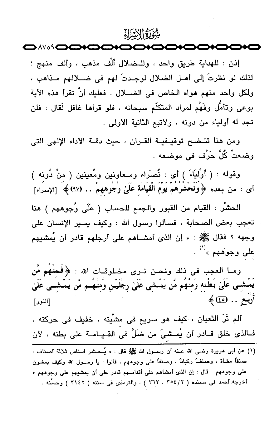 الحشْر: القيام من القبر والجمع للحساب {على وُجُوهِهِمْ} هنا تعجب بعض الصحابة، فسألوا رسول الله: وكيف يسير الإنسان على وجهه؟ فقال صَلَّى اللَّهُ عَلَيْهِ وَسَلَّم َ: «إن الذي أمشاهم على أرجلهم قادر أن يُمشيهم على وجوههم» .