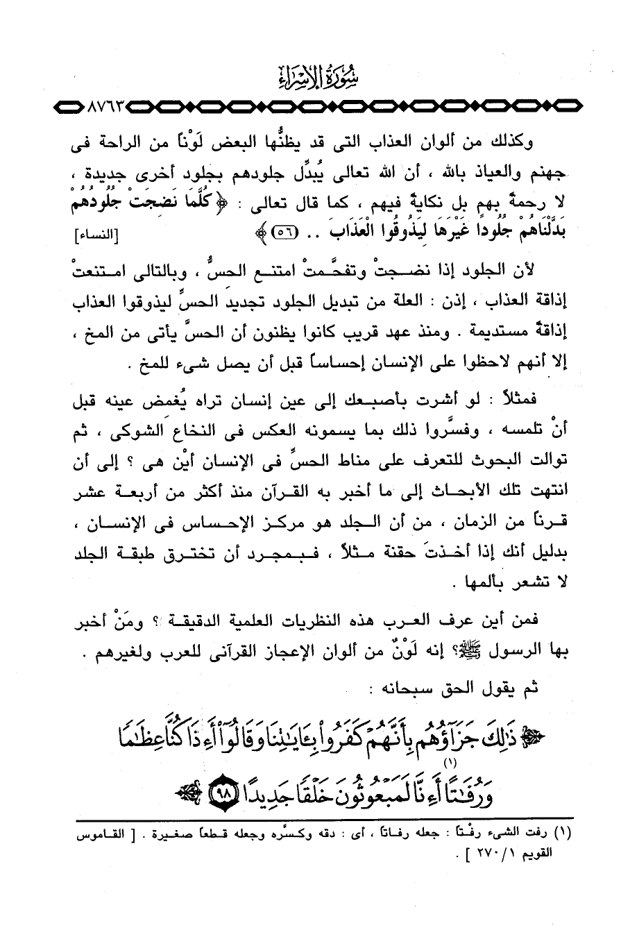 فمثلاً: لو أشرت بأصبعك إلى عين إنسان تراه يُغمِض عينه قبل أنْ تلمسه، وفسَّروا ذلك بما يسمونه العكس في النخاع الشوكي، ثم توالت البحوث للتعرف على مناط الحسِّ في الإنسان أيْن هي؟ إلى أن انتهت تلك الأبحاث إلى ما أخبر به القرآن منذ أكثر من أربعة عشر قرناً من الزمان، من أن الجلد هو مركز الإحساس في الإنسان، بدليل أنك إذا أخذتَ حقنة مثلاً، فبمجرد أن تخترق طبقة الجلد لا تشعر بألمها.
