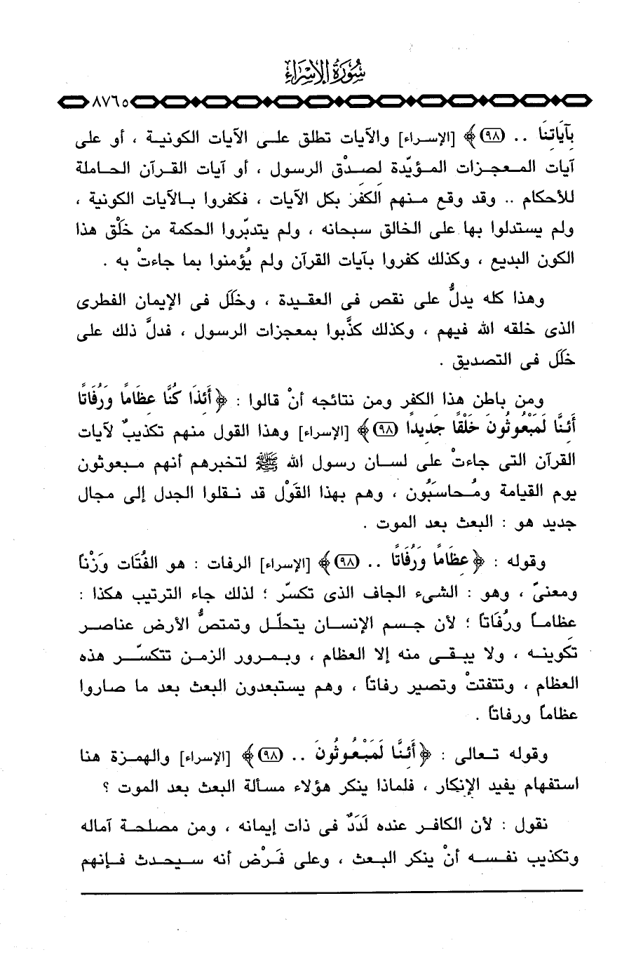 بِآيَاتِنَا. .} [الإسراء: 98] والآيات تطلق على الآيات الكونية، أو على آيات المعجزات المؤيّدة لِصِدْق الرسول، أو آيات القرآن الحاملة للأحكام. . وقد وقع منهم الكفر بكل الآيات، فكفروا بالآيات الكونية، ولم يستدلوا بها على الخالق سبحانه، ولم يتدبّروا الحكمة من خَلْق هذا الكون البديع، وكذلك كفروا بآيات القرآن ولم يُؤمنوا بما جاءتْ به.
