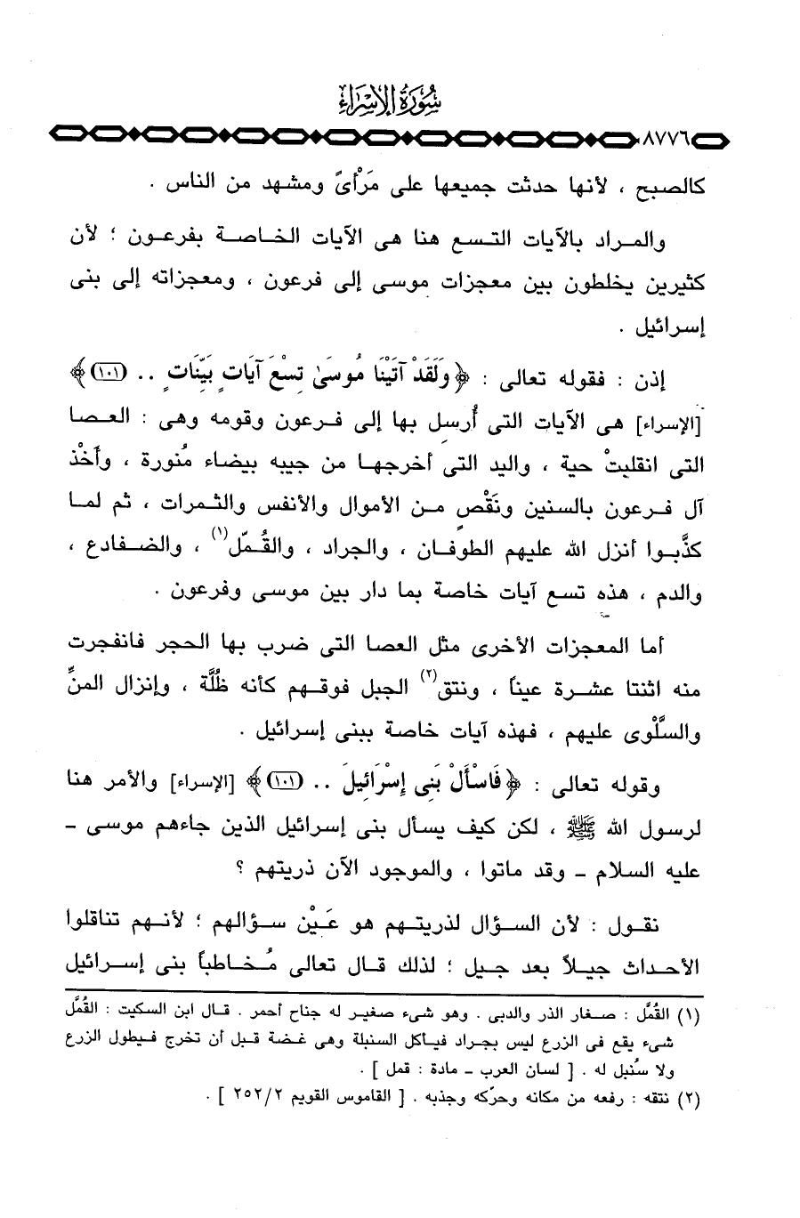 إذن: فقوله تعالى: {وَلَقَدْ آتَيْنَا موسى تِسْعَ آيَاتٍ بَيِّنَاتٍ. .} [الإسراء: 101] هي الآيات التي أُرسِل بها إلى فرعون وقومه وهي: العصا التي انقلبتْ حية، واليد التي أخرجها من جيبه بيضاء مُنورة، وأَخْذ آل فرعون بالسنين ونَقْصٍ من الأموال والأنفس والثمرات، ثم لما كذَّبوا أنزل الله عليهم الطوفان، والجراد، والقُمّل، والضفادع، والدم، هذه تسع آيات خاصة بما دار بين موسى وفرعون.
