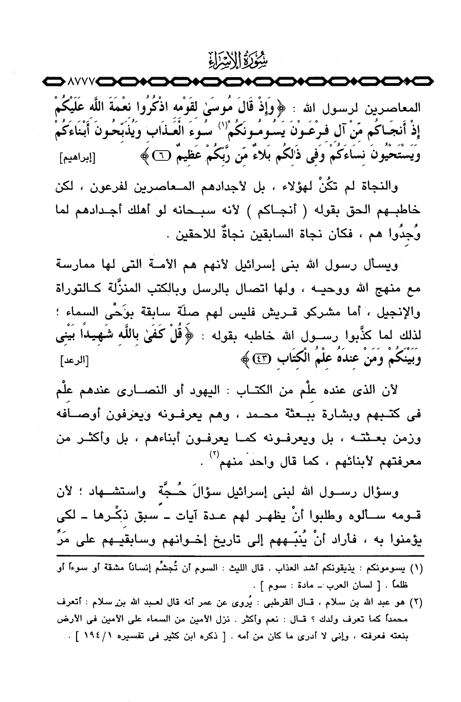 المعاصرين لرسول الله: {وَإِذْ قَالَ موسى لِقَوْمِهِ اذكروا نِعْمَةَ الله عَلَيْكُمْ إِذْ أَنجَاكُمْ مِّنْ آلِ فِرْعَوْنَ يَسُومُونَكُمْ سواء العذاب وَيُذَبِّحُونَ أَبْنَآءَكُمْ وَيَسْتَحْيُونَ نِسَآءَكُمْ وَفِي ذلكم بلاء مِّن رَّبَّكُمْ عَظِيمٌ} [إبراهيم: 6]