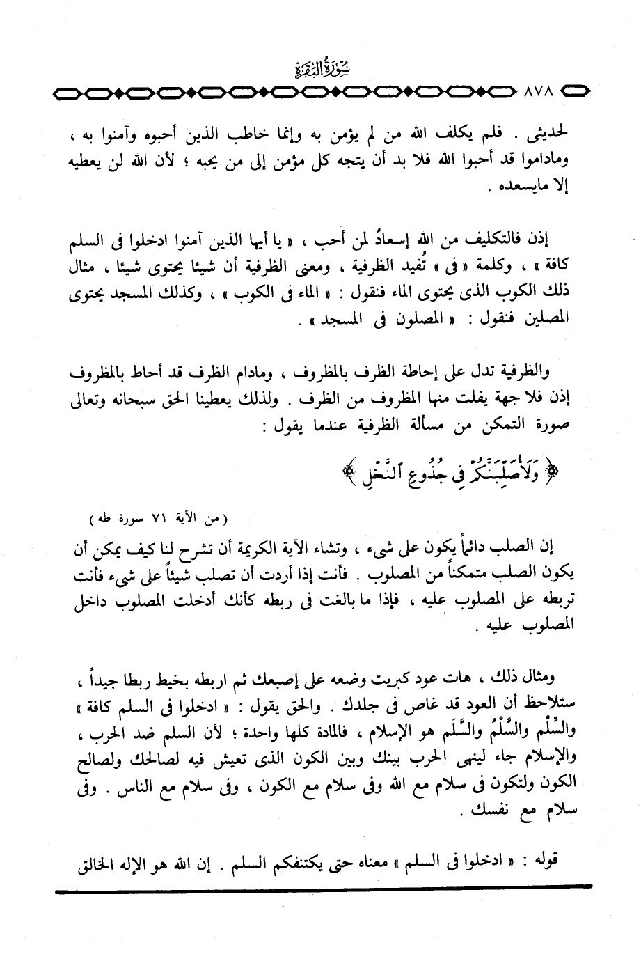 إذن فالتكليف من الله إسعادٌ لمن أحب، {ياأيها الذين آمَنُواْ ادخلوا فِي السلم كَآفَّةً} ، وكلمة «في» تُفيد الظرفية، ومعنى الظرفية أن شيئا يحتوي شيئا، مثال ذلك الكوب الذي يحتوي الماء فنقول: «الماء في الكوب» ، وكذلك المسجد يحتوي المصلين فنقول: «المصلون في المسجد» .
