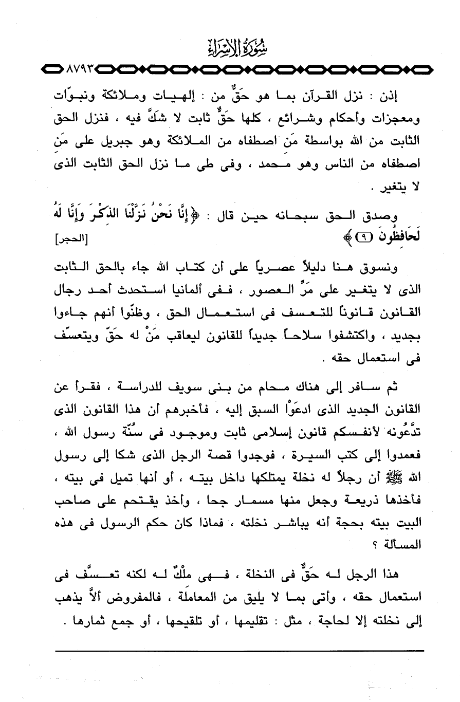 ونسوق هنا دليلاً عصرياً على أن كتاب الله جاء بالحق الثابت الذي لا يتغير على مَرِّ العصور، ففي ألمانيا استحدث أحد رجال القانون قانوناً للتعسف في استعمال الحق، وظنّوا أنهم جاءوا بجديد، واكتشفوا سلاحاً جديداً للقانون ليعاقب مَنْ له حَقّ ويتعسّف في استعمال حقه.