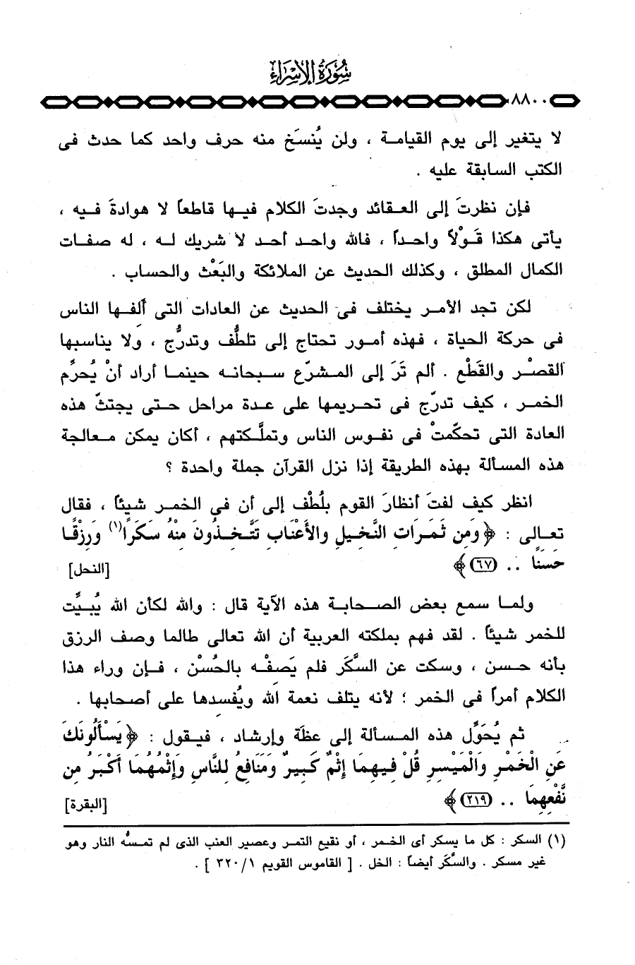 ولما سمع بعض الصحابة هذه الآية قال: والله لكأن الله يُبيِّت للخمر شيئاً، لقد فهم بملكته العربية أن الله تعالى طالما وصف الرزق بأنه حسن، وسكت عن السَّكَر فلم يَصِفْه بالحُسْن، فإن وراء هذا الكلام أمراً في الخمر؛ لأنه يتلف نعمة الله ويُفسِدها على أصحابها.