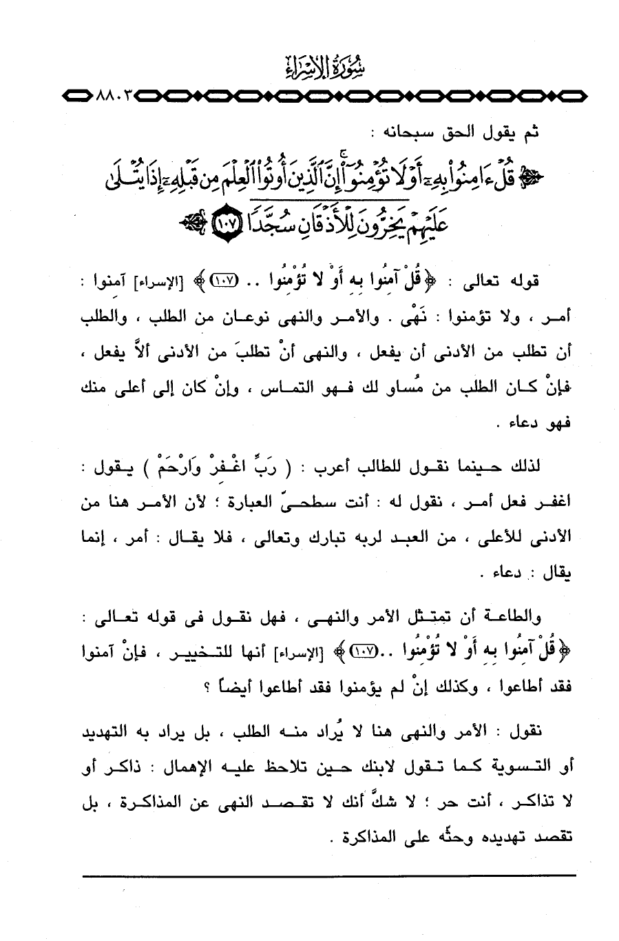 قوله تعالى: {قُلْ آمِنُواْ بِهِ أَوْ لاَ تؤمنوا. .} [الإسراء: 107] آمنوا: أمر، ولا تؤمنوا: نَهْي. والأمر والنهي نوعان من الطلب، والطلب أن تطلب من الأدنى أن يفعل، والنهي أنْ تطلبَ من الأدنى ألاَّ يفعل، فإنْ كان الطلب من مُساو لك فهو التماس، وإنْ كان من أعلى منك فهو دعاء.