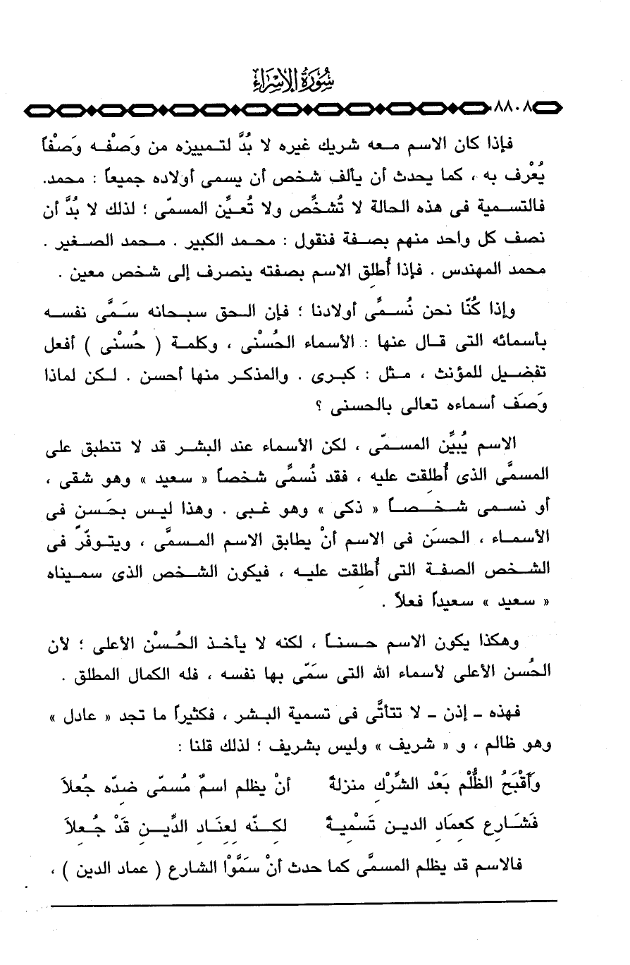 الاسم يُبيِّن المسمّي، لكن الأسماء عند البشر قد لا تنطبق على المسمَّى الذي أُطلقت عليه، فقد نُسمِّي شخصاً «سعيد» وهو شقي، أو نسمي شخصاً «ذكي» وهو غبي. وهذا ليس بحَسنٍ في الأسماء، الحسَن في الاسم أنْ يطابق الاسم المسمَّى، ويتوفّر في الشخص الصفة التي أُطلِقت عليه، فيكون الشخص الذي سميناه «سعيد» سعيداً فعلاً.