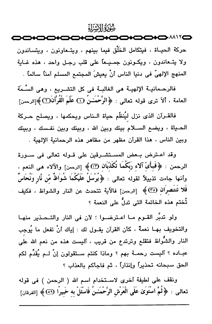 وقد اعترض بعض المستشرقين على قوله تعالى في سورة الرحمن: {فَبِأَيِّ آلاء رَبِّكُمَا تُكَذِّبَانِ} [الرحمن: 13] والآلاء هي النعم، وأنها جاءت تذييلاً لقوله تعالى: {يُرْسَلُ عَلَيْكُمَا شُوَاظٌ مِّن نَّارٍ وَنُحَاسٌ فَلاَ تَنتَصِرَانِ} [الرحمن: 35] فالآية تتحدث عن النار والشواظ، فكيف تُختم هذه الخاتمة التي تدلُّ على النعمة؟