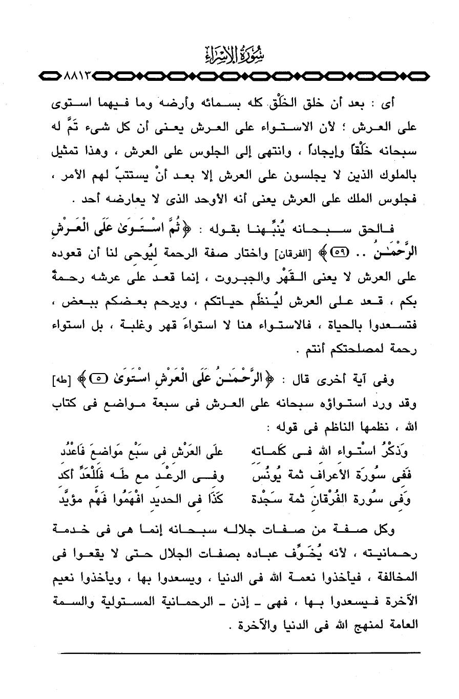 وقد ورد استواؤه سبحانه على العرش في سبعة مواضع في كتاب الله، نظمها الناظم في قوله: