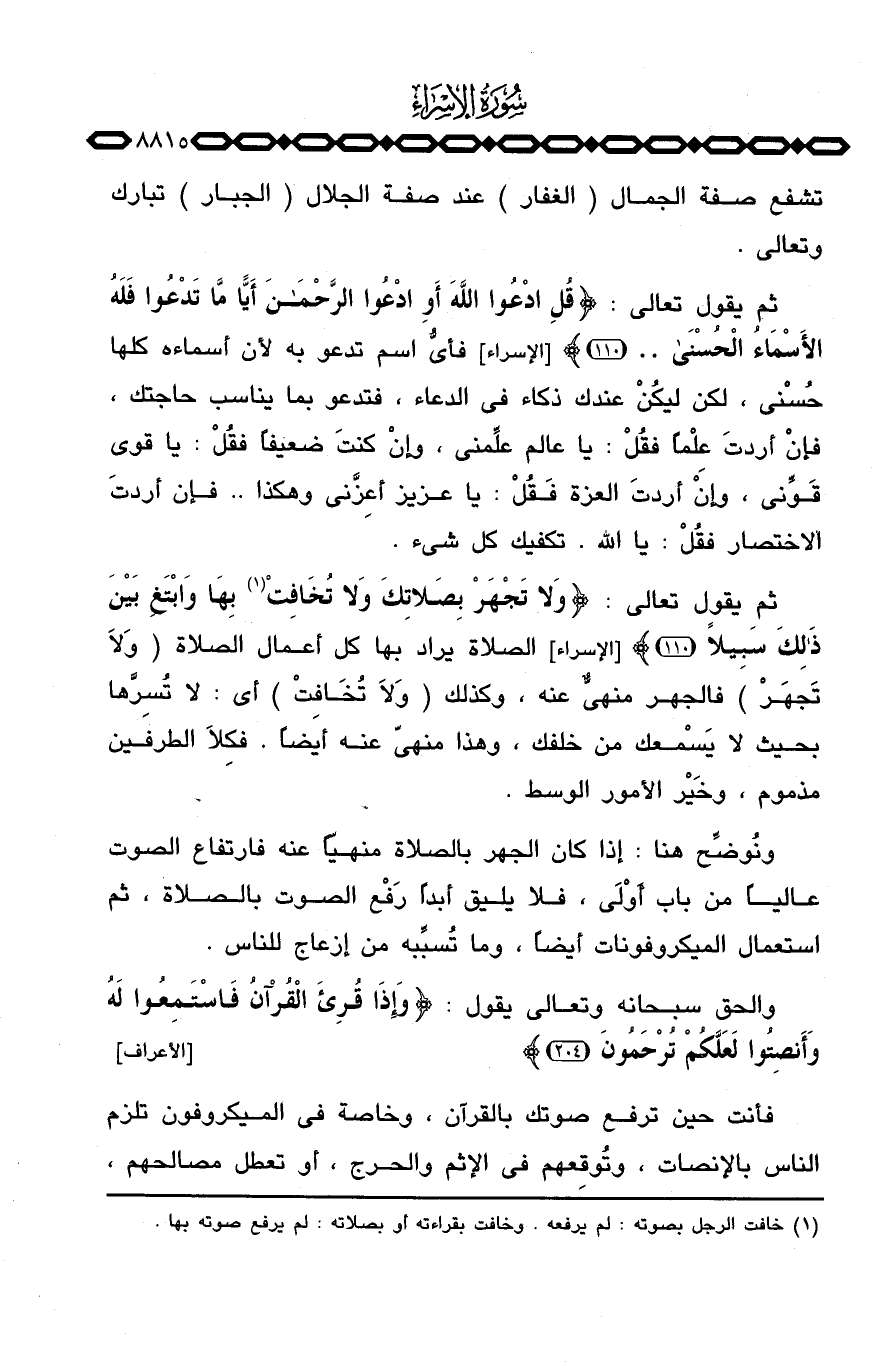ثم يقول تعالى: {وَلاَ تَجْهَرْ بِصَلاَتِكَ وَلاَ تُخَافِتْ بِهَا وابتغ بَيْنَ ذلك سَبِيلاً} [الإسراء: 110] الصلاة يراد بها كل أعمال الصلاة {وَلاَ تَجْهَرْ} فالجهر منهيٌّ عنه، وكذلك {وَلاَ تُخَافِتْ} أي: لا تُسِرَّها بحيث لا يَسْمعك من خلفك، وهذا منهيّ عنه أيضاً.