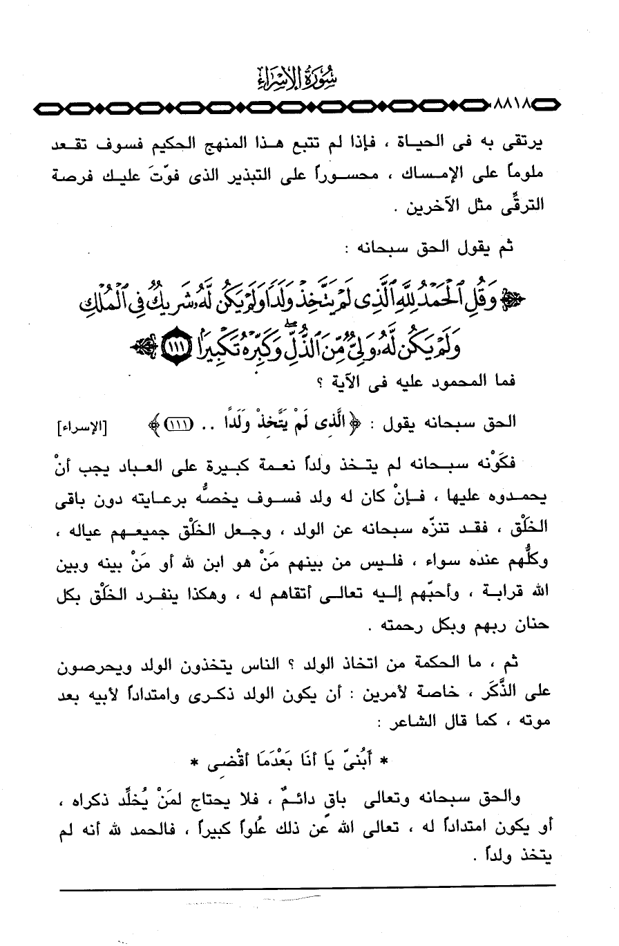 أَبُنيّ يَا أنَا بَعْدَمَا أقْضِي ... والحق سبحانه وتعالى باقٍ دائمٌ، فلا يحتاج لمَنْ يُخلِّد ذكراه، أو يكون امتداداً له، تعالى الله عن ذلك عُلواً كبيراً، فالحمد لله أنه لم يتخذ ولداً.