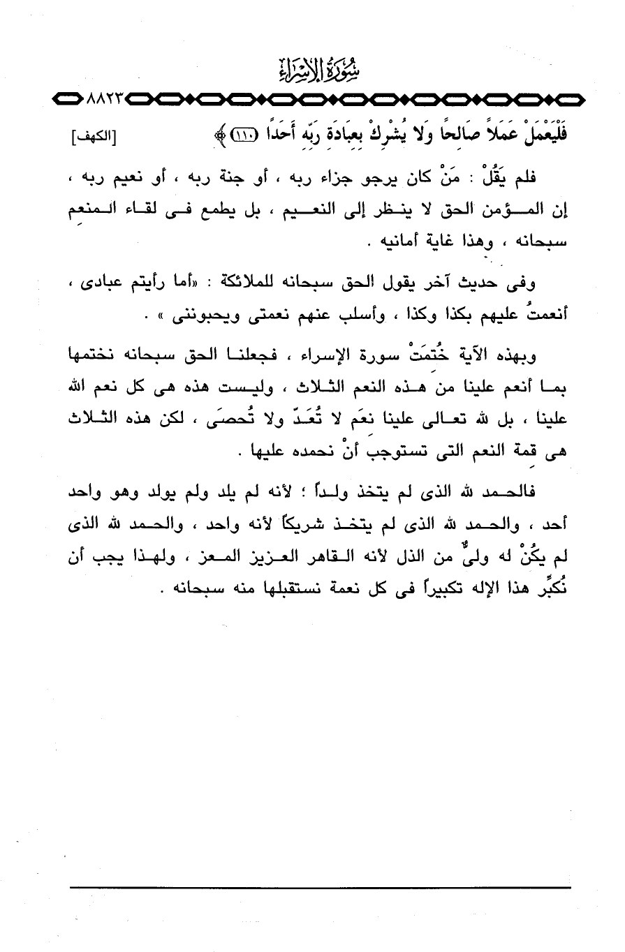 وبهذه الآية خُتِمَتْ سورة الإسراء، فجعلنا الحق سبحانه نختمها بما أنعم علينا من هذه النعم الثلاث، وليس هذه هي كل نعم الله علينا، بل لله تعالى علينا نِعَم لا تُعَدّ ولا تُحصَى، لكن هذه الثلاث هي قِمة النعم التي تستوجب أنْ نحمده عليها.