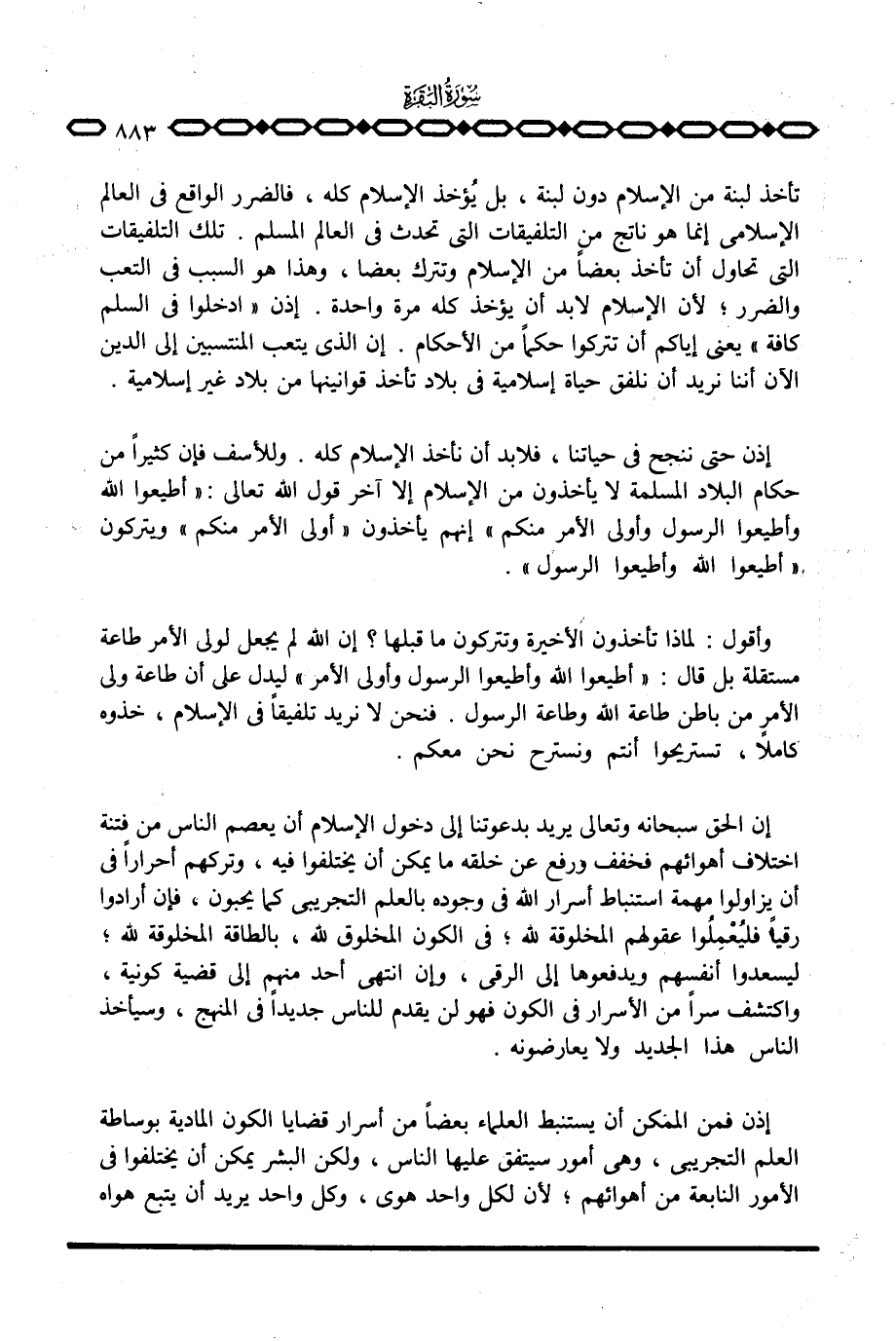 أن تأخذ لبنة من الإسلام دون لبنة، بل يُؤخذ الإسلام كله، فالضرر الواقع في العالم الإسلامي إنما هو ناتج من التلفيقات التي تحدث في العالم المسلم. تلك التلفيقات التي تحاول أن تأخذ بعضاً من الإسلام وتترك بعضا، وهذا هو السبب في التعب والضرر؛ لأن الإسلام لابد أن يؤخذ كله مرة واحدة. إذن {ادخلوا فِي السلم كَآفَّةً} يعني إياكم أن تتركوا حكماً من الأحكام. إن الذي يتعب المنتسبين إلى الدين الآن أننا نريد أن نلفق حياة إسلامية في بلاد تأخذ قوانينها من بلاد غير إسلامية.