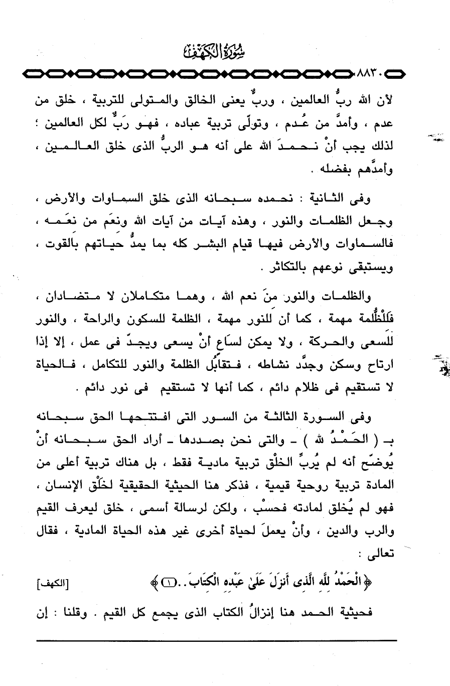وفي السورة الثالثة من السور التي افتتحها الحق سبحانه ب {الحمد لِلَّهِ} والتي نحن بصددها أراد الحق سبحانه أنْ يُوضّح أنه لم يُربِّ الخلْق تربية مادية فقط، بل هناك تربية أعلى من المادة تربية روحية قيمية، فذكر هنا الحيثية الحقيقية لخَلْق الإنسان، فهو لم يُخلق لمادته فحسْب، ولكن لرسالة أسمى، خلق ليعرف القيم والرب والدين، وأنْ يعملَ لحياة أخرى غير هذه الحياة المادية، فقال تعالى: {الحمد لِلَّهِ الذي أَنْزَلَ على عَبْدِهِ الكتاب. .} [الكهف: 1]