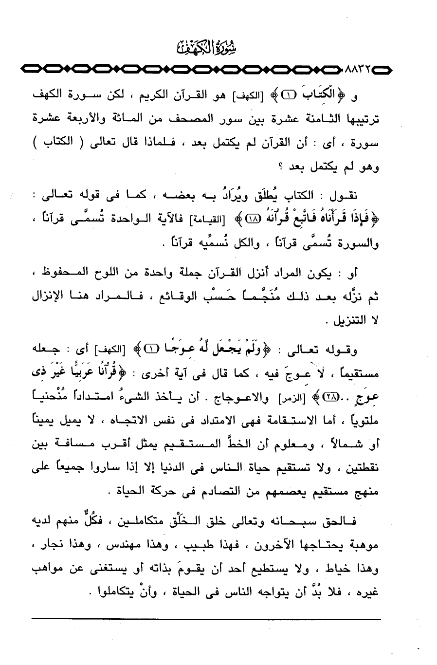 وقوله تعالى: {وَلَمْ يَجْعَل لَّهُ عِوَجَا} [الكهف: 1] أي: جعله مستقيماً، لا عِوجَ فيه، كما قال في آية أخرى: {قُرْآناً عَرَبِيّاً غَيْرَ ذِي عِوَجٍ. .} [الزمر: 28] والاعوجاج، أن يأخذ الشيءُ امتداداً مُنْحنياً ملتوياً، أما الاستقامة فهي الامتداد في نفس الاتجاه، لا يميل يميناً أو شمالاً، ومعلوم أن الخطَّ المستقيم يمثل أقرب مسافة بين نقطتين، ولا تستقيم حياة الناس في الدنيا إلا إذا ساروا جميعاً على منهج مستقيم يعصمهم من التصادم في حركة الحياة.