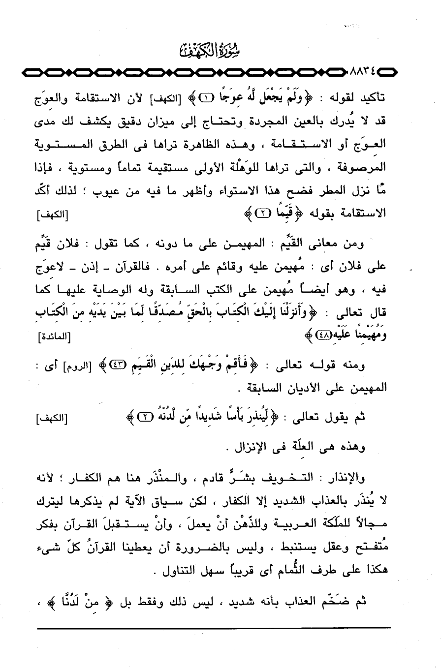 تأكيد لقوله: {وَلَمْ يَجْعَل لَّهُ عِوَجَا} [الكهف: 1] لأن الاستقامة والعِوَج قد لا يُدرك بالعين المجردة وتحتاج إلى ميزان دقيق يكشف لك مدى العِوَج أو الاستقامة، وهذه الظاهرة تراها في الطرق المستوية المرصوفة، والتي تراها للوَهْلة الأولى مستقيمة تماماً ومستوية، فإذا ما نزل المطر فضح هذا الاستواء وأظهر ما فيه من عيوب؛ لذلك أكّد الاستقامة بقوله: {قَيِّماً} [الكهف: 2]