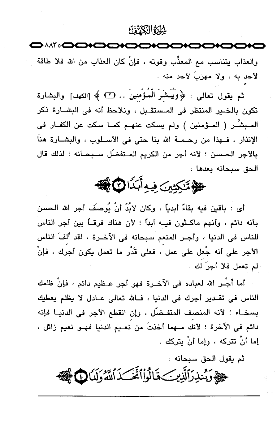ثم يقول تعالى: {وَيُبَشِّرَ المؤمنين} [الكهف: 2] والبشارة تكون بالخير المنتظر في المستقبل، وتلاحظ أنه في البشارة ذكر المبشَّر {المؤمنين} ولم يسكت عنهم كما سكت عن الكفار في الإنذار، فهذا من رحمة الله بنا حتى في الأسلوب، والبشارة هنا بالأجر الحسن؛ لأنه أجر من الكريم المتفضّل سبحانه؛ لذلك قال الحق سبحانه بعدها: {مَّاكِثِينَ فِيهِ أَبَداً} .