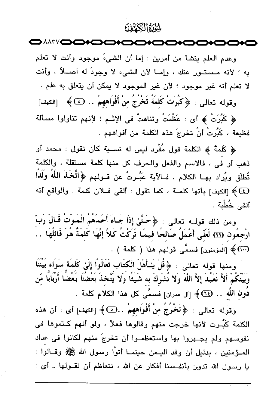 وقوله تعالى: {تَخْرُجُ مِنْ أَفْوَاهِهِمْ. .} [الكهف: 5] أي: أن هذه الكلمة كَبُرت لأنها خرجت منهم وقالوها فعلاً، ولو أنهم كتموها في نفوسهم ولم يجهروا بها واستعظموا أن تخرجَ منهم لكانوا في عداد المؤمنين، بدليل أن وفد اليمن حينما أتوْا رسول الله صَلَّى اللَّهُ عَلَيْهِ وَسَلَّم َ وقالوا: يا رسول الله تدور بأنفسنا أفكار عن الله، نتعاظم أن نقولها أي: