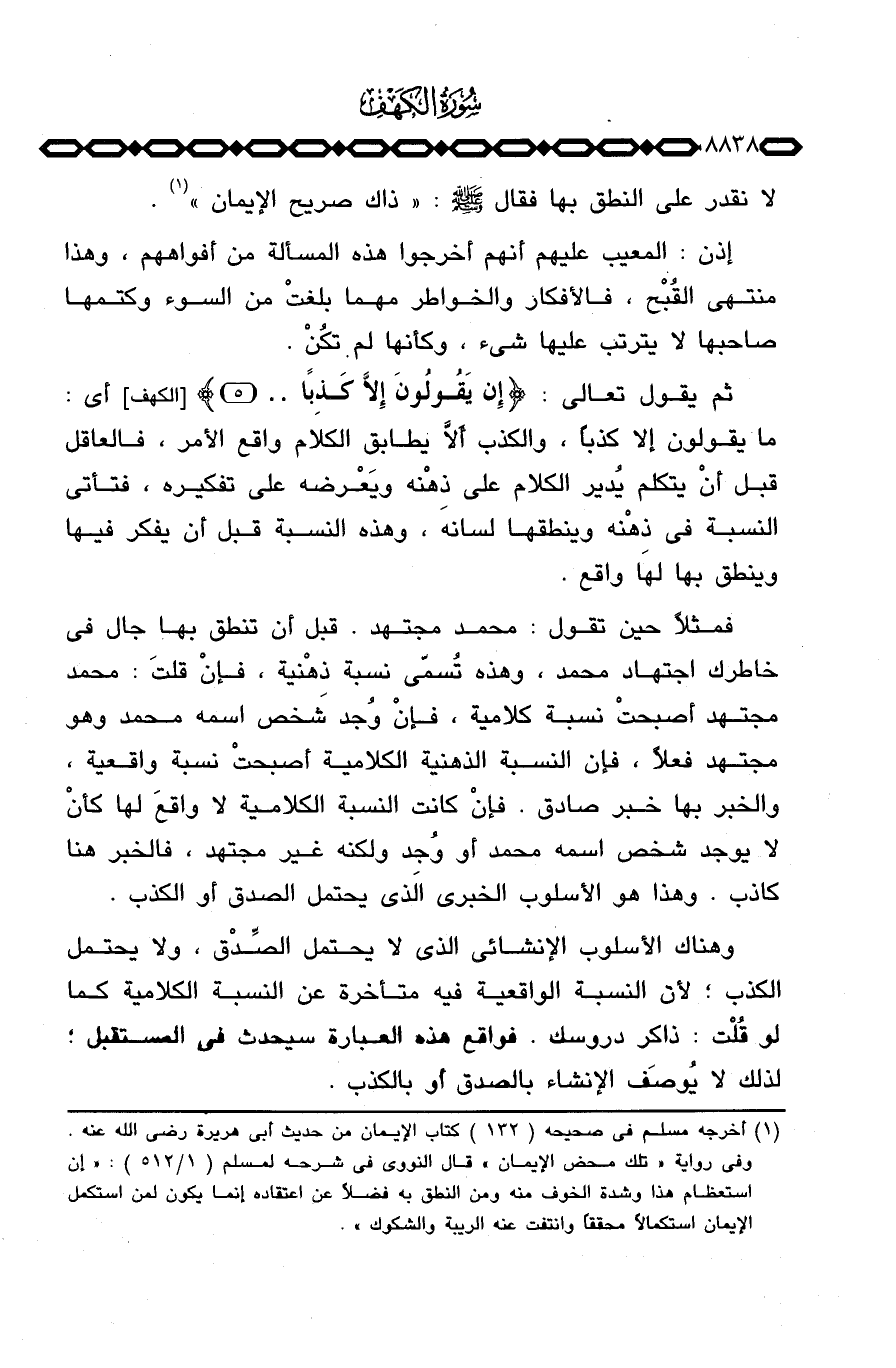 ثم يقول تعالى: {إِن يَقُولُونَ إِلاَّ كَذِباً. .} [الكهف: 5] أي: ما يقولون إلا كذباً، والكذب أَلاَّ يطابق الكلام واقع الأمر، فالعاقل قبل أنْ يتكلم يُدير الكلام على ذِهْنه ويَعْرضه على تفكيره، فتأتي النسبة في ذِهْنه وينطقها لسانه، وهذه النسبة قبل أن يفكر فيها وينطق بها لها واقع.