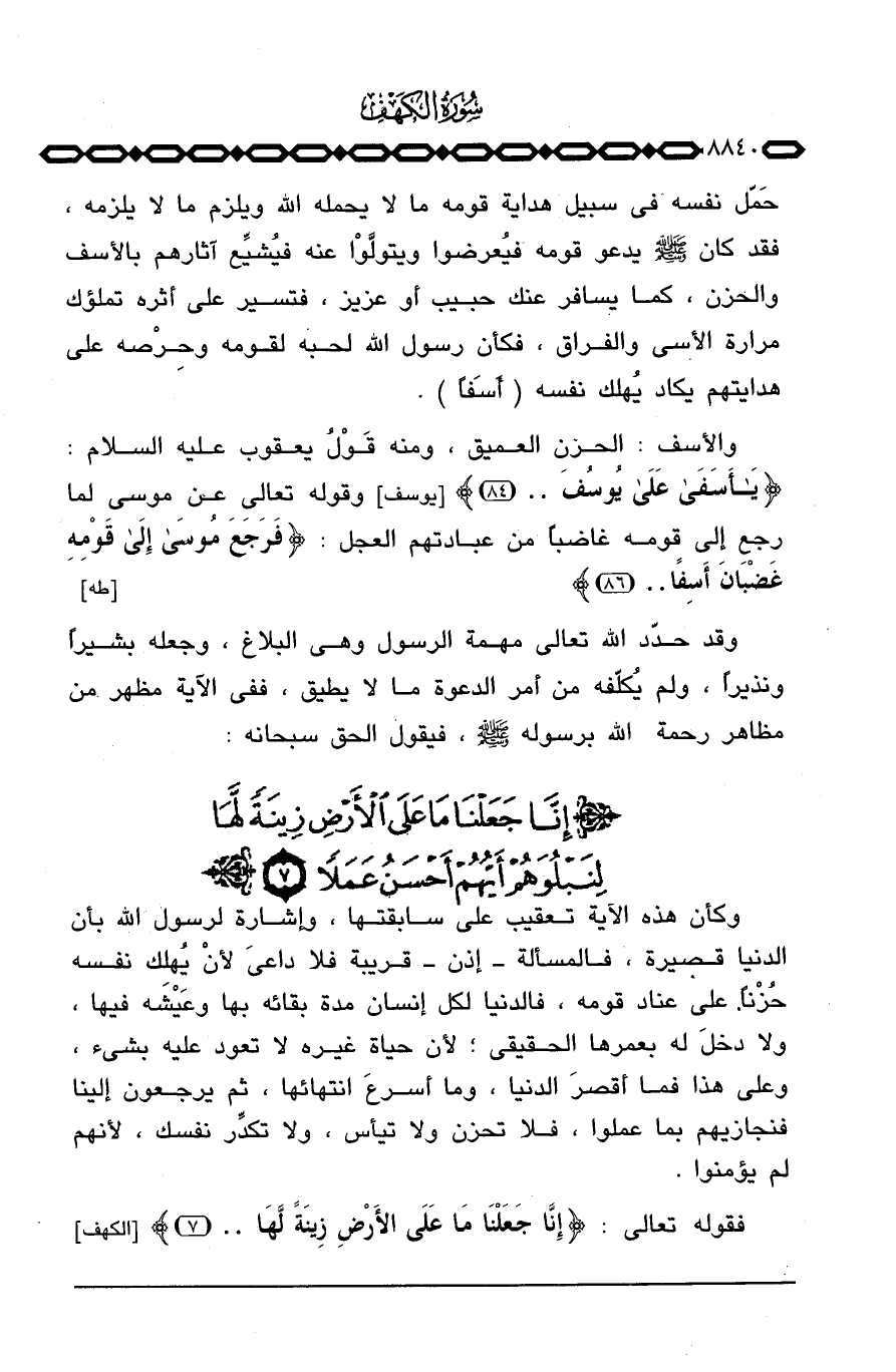 حَمّل نفسه في سبيل هداية قومه ما لا يحمله الله ويلزم ما لا يلزمه، فقد كان صَلَّى اللَّهُ عَلَيْهِ وَسَلَّم َ يدعو قومه فيُعرضوا ويتولَّوْا عنه فيُشيِّع آثارهم بالأسف والحزن، كما يسافر عنك حبيب أو عزيز، فتسير على أثره تملؤك مرارة الأسى والفراق، فكأن رسول الله لحبه لقومه وحِرْصه على هدايتهم يكاد يُهلك نفسه {أَسَفاً} .