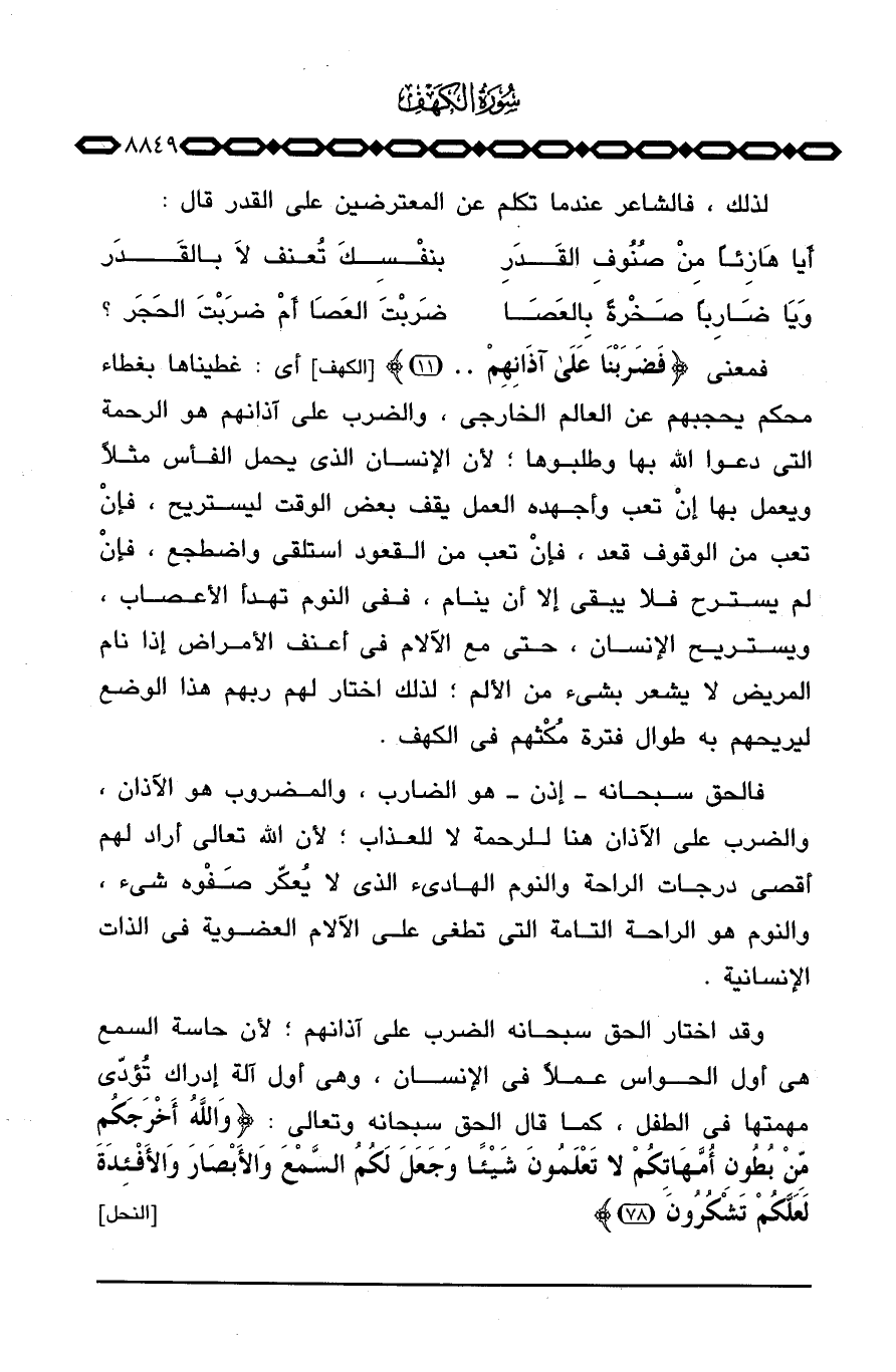 فالحق سبحانه إذن هو الضارب، والمضروب هو الآذان، والضرب على الآذان هنا للرحمة لا للعذاب؛ لأن الله تعالى أراد لهم أقصى درجات الراحة والنوم الهادئ الذي لا يُعكّر صَفْوه شيء، والنوم هو الراحة التامة التي تطغى على الآلام العضوية في الذات الإنسانية.