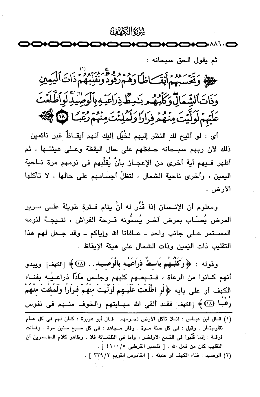 وقوله: {وَكَلْبُهُمْ بَاسِطٌ ذِرَاعَيْهِ بالوصيد} [الكهف: 18] ويبدو أنهم كانوا من الرعاة، فتبعهم كلبهم وجلس مَادّاً ذراعيْه بفناء الكهف أو على بابه {لَوِ اطلعت عَلَيْهِمْ لَوَلَّيْتَ مِنْهُمْ فِرَاراً وَلَمُلِئْتَ مِنْهُمْ رُعْباً} [الكهف: 18] فقد ألقى الله مهابتهم والخوف منهم في نفوس