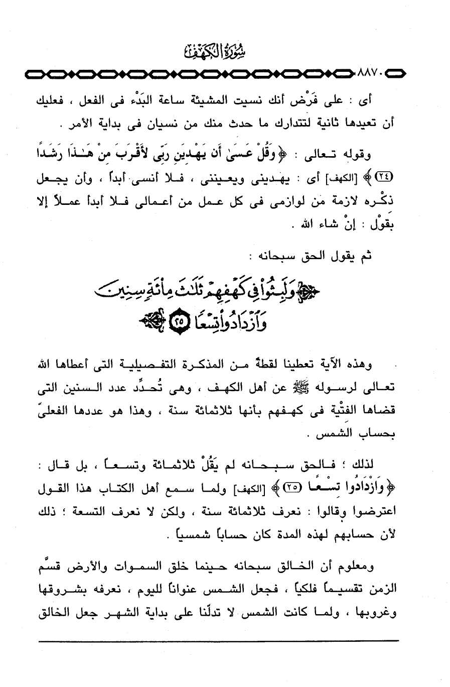 وهذه الآية تعطينا لقطةً من المذكرة التفصيلية التي أعطاها الله تعالى لرسوله صَلَّى اللَّهُ عَلَيْهِ وَسَلَّم َ عن أهل الكهف، وهي تُحدِّد عدد السنين التي قضاها الفِتْية في كهفهم بأنها ثلاثمائة سنة، وهذا هو عددها الفعليّ بحساب الشمس.