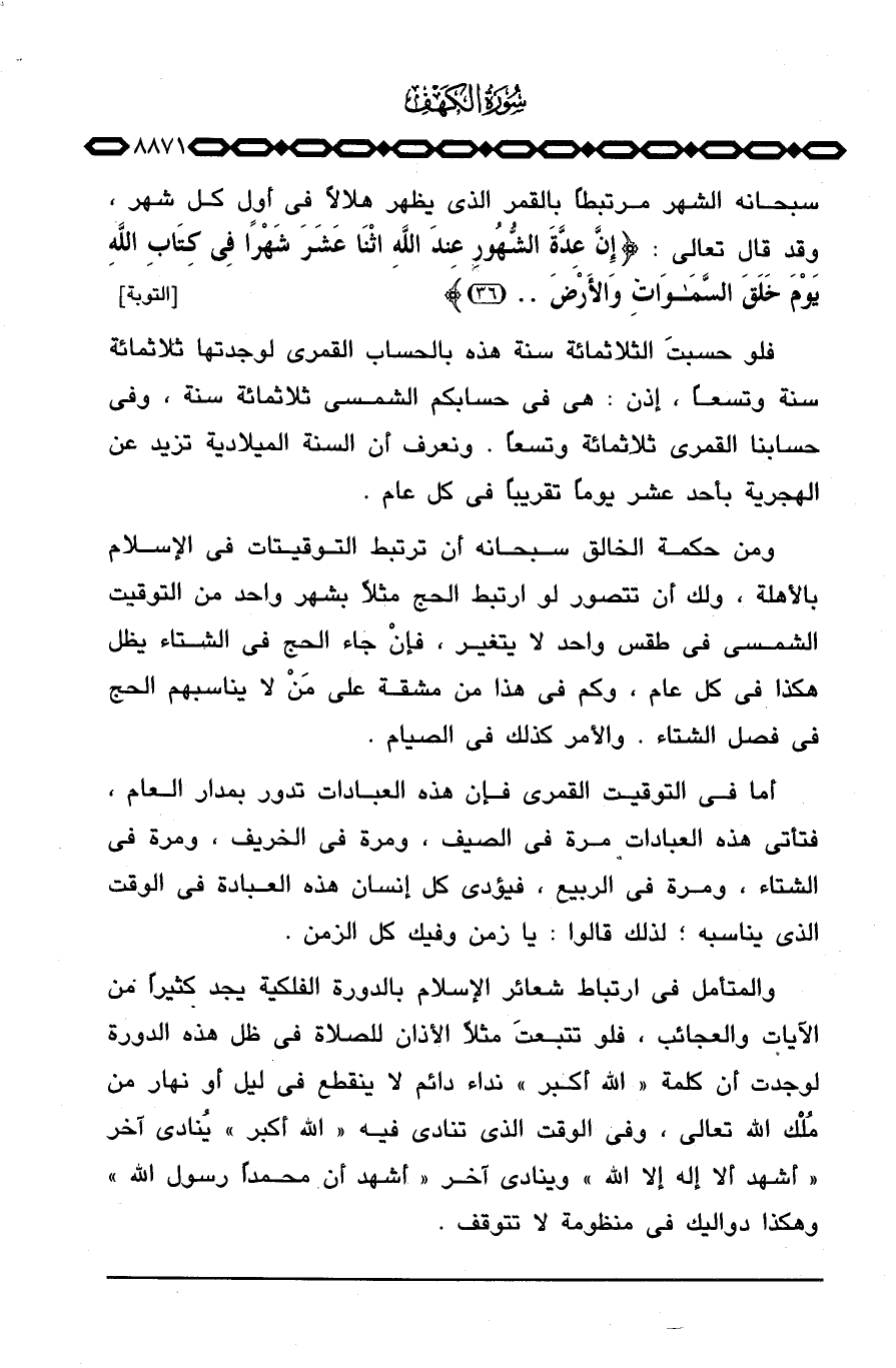 والمتأمل في ارتباط شعائر الإسلام بالدورة الفلكية يجد كثيراً من الآيات والعجائب، فلو تتبعتَ مثلاً الأذان للصلاة في ظل هذه الدورة لوجدت أن كلمة «الله أكبر» نداء دائم لا ينقطع في ليل أو نهار من مُلْك الله تعالى، وفي الوقت الذي تنادي فيه «الله أكبر» يُنادي آخر «أشهد ألا إله إلا الله» وينادي آخر «أشهد أن محمداً رسول الله» وهكذا دواليك في منظومة لا تتوقف.