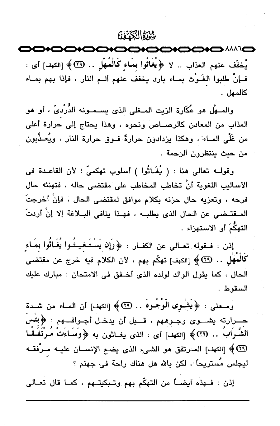 ومعنى: {يَشْوِي الوجوه. .} [الكهف: 29] أن الماء من شدة حرارته يشوي وجوههم، قبل أن يدخل أجوافهم: {بِئْسَ الشراب. .} [الكهف: 29] أي: الذي يغاثون به {وَسَآءَتْ مُرْتَفَقاً} [الكهف: 29] المرتفق هو الشيء الذي يضع الإنسان عليه مِرْفقه ليجلس مُستريحاً، لكن بالله هل هناك راحة في جهنم؟