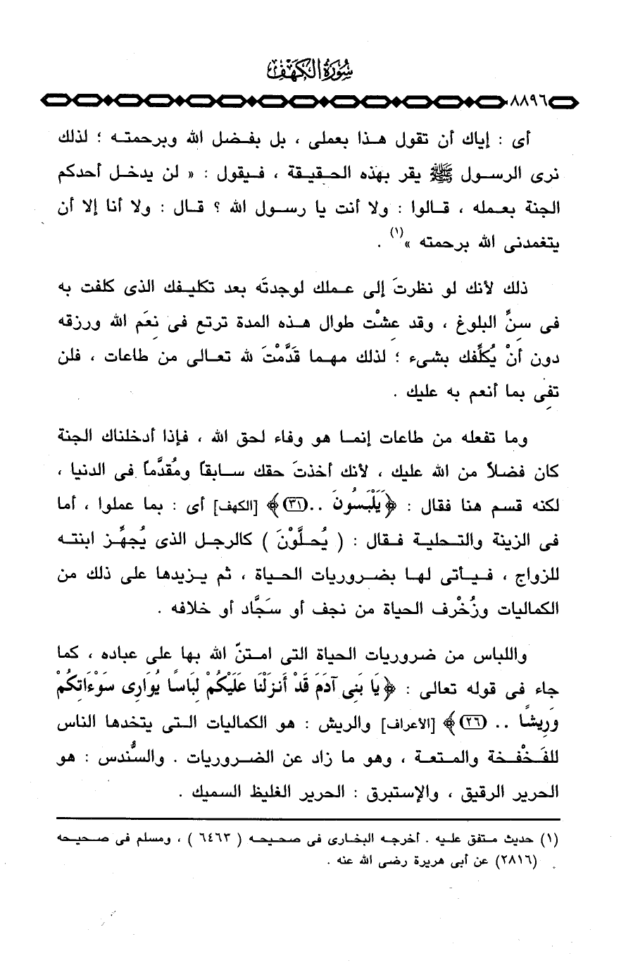 وما تفعله من طاعات إنما هو وفاء لحق الله، فإذا أدخلناك الجنة كان فضلاً من الله عليك، لأنك أخذتَ حقك سابقاً ومُقدَّماً في الدنيا، لكنه قسم هنا فقال: {يَلْبَسُونَ. .} [الكهف: 31] أي: بما عملوا، أما في الزينة والتحلية فقال: {يُحَلَّوْنَ} كالرجل الذي يُجهِّز ابنته للزواج، فيأتي لها بضروريات الحياة، ثم يزيدها على ذلك من الكماليات وزُخْرف الحياة من نجف أو سَجَّاد أو خلافه.