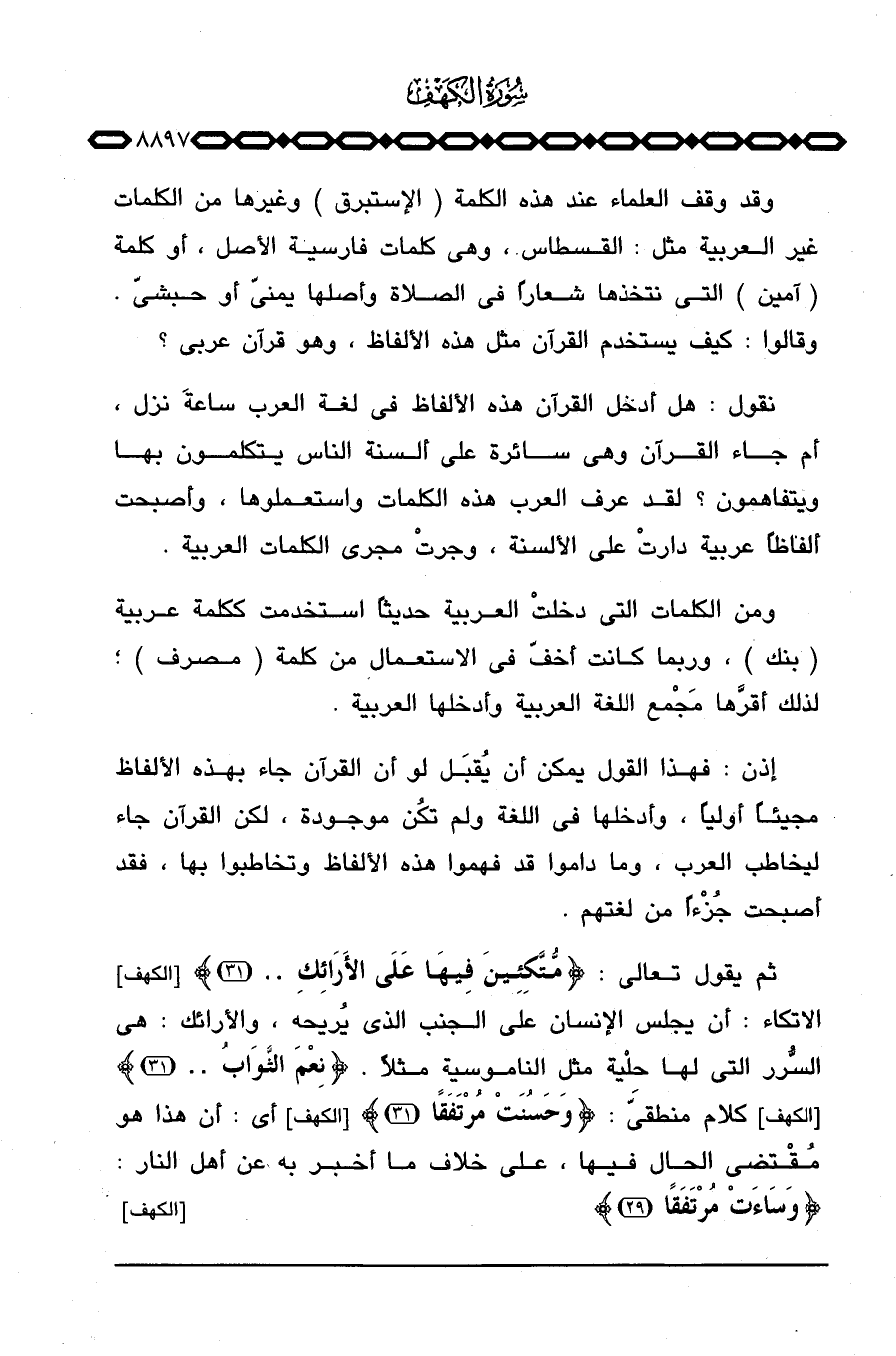 وقد وقف العلماء عند هذه الكلمة {إِسْتَبْرَقٍ} وغيرها من الكلمات غير العربية مثل: القسطاس، وهي كلمات فارسية الأصل، أو كلمة (آمين) التي نتخذها شعاراً في الصلاة وأصلها يمني أو حبشي. وقالوا: كيف يستخدم القرآن مثل هذه الألفاظ، وهو قرآن عربي؟