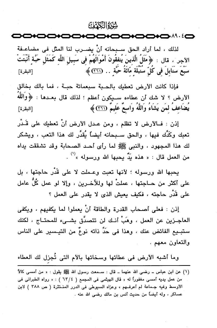 إذن: فالأرض لا تظلم، ومن عدل الأرض أنْ تعطيك على قَدْر تعبك وكَدِّك فيها، والحق سبحانه أيضاً يُقدِّر لك هذا التعب، ويشكر لك هذا المجهود، والنبي صَلَّى اللَّهُ عَلَيْهِ وَسَلَّم َ لما رأى أحد الصحابة وقد تشققت يداه من العمل قال: «هذه يَدٌ يحبها الله ورسوله» .