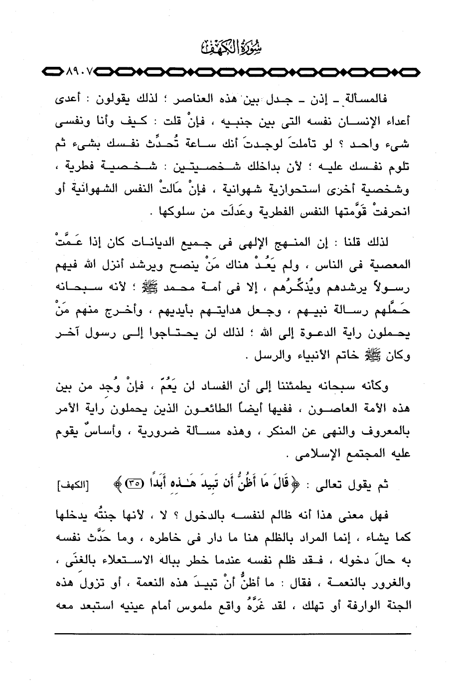 فهل معنى هذا أنه ظالم لنفسه بالدخول؟ لا، لأنها جنتُه يدخلها كما يشاء، إنما المراد بالظلم هنا ما دار في خاطره، وما حَدَّث نفسه به حالَ دخوله، فقد ظلم نفسه عندما خطر بباله الاستعلاء بالغِنَى، والغرور بالنعمة، فقال: ما أظنُّ أنْ تبيدَ هذه النعمة، أو تزول هذه الجنة الوارفة أو تهلك، لقد غَرَّهُ واقع ملموس أمام عينيه استبعد معه