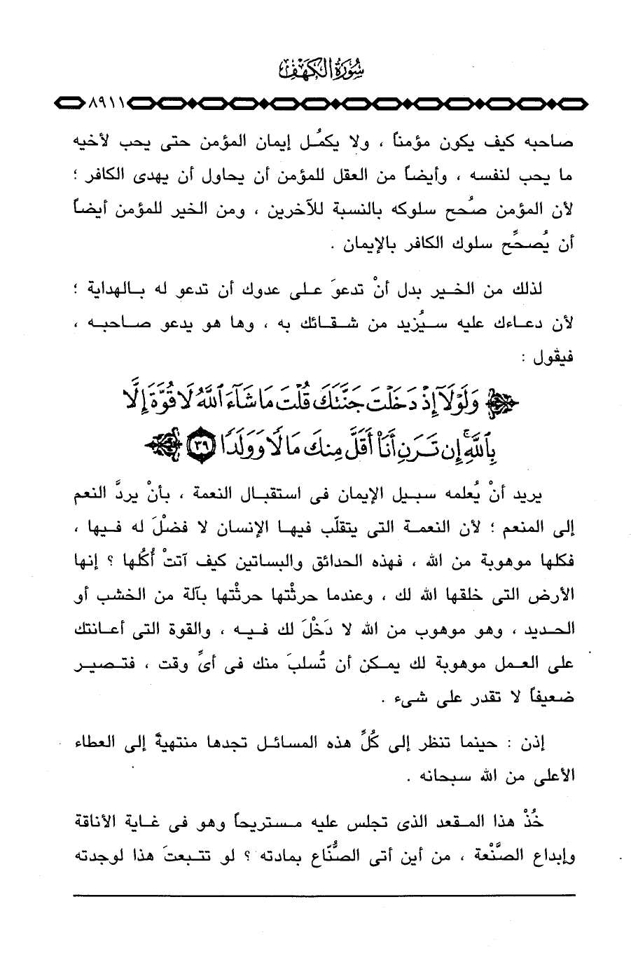 لذلك من الخير بدل أنْ تدعوَ على عدوك أن تدعو له بالهداية؛ لأن دعاءك عليه سيُزيد من شقائك به، وها هو يدعو صاحبه، فيقول: {ولولا إِذْ دَخَلْتَ جَنَّتَكَ قُلْتَ مَا شَآءَ الله لاَ قُوَّةَ إِلاَّ بالله ... } .