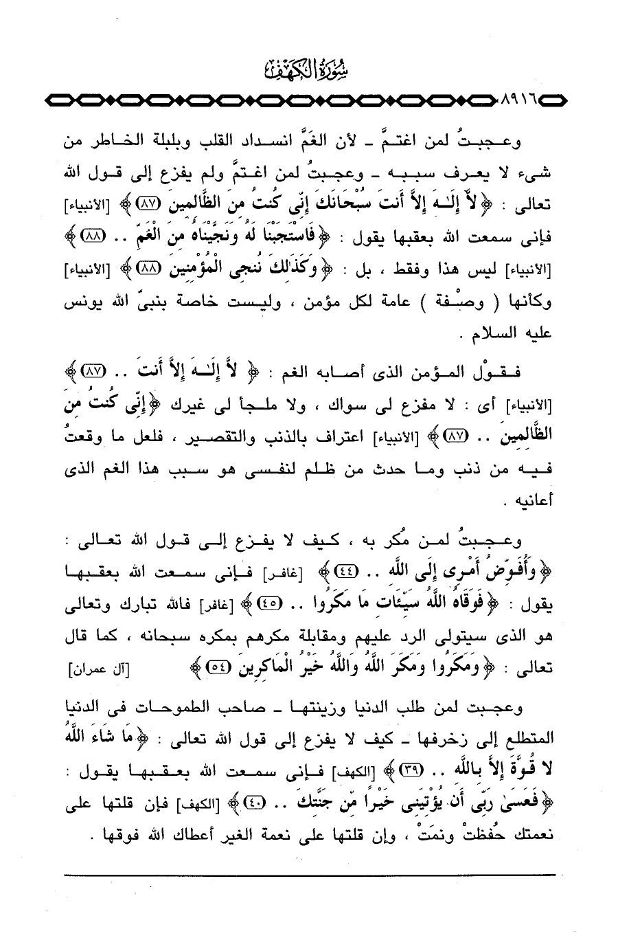 وعجبتُ لمن اغتمَّ لأن الغَمَّ انسداد القلب وبلبلة الخاطر من شيء لا يعرف سببه وعجبتُ لمن اغتمَّ ولم يفزع إلى قول الله تعالى: {لاَّ إله إِلاَّ أَنتَ سُبْحَانَكَ إِنِّي كُنتُ مِنَ الظالمين} [الأنبياء: 87] فإني سمعت الله بعقبها يقول: {فاستجبنا لَهُ وَنَجَّيْنَاهُ مِنَ الغم} [الأنبياء: 88] ليس هذا وفقط، بل: {وكذلك نُنجِي المؤمنين} [الأنبياء: 88] وكأنها (وصْفة) عامة لكل مؤمن، وليست خاصة بنبيّ الله يونس عليه السلام.
