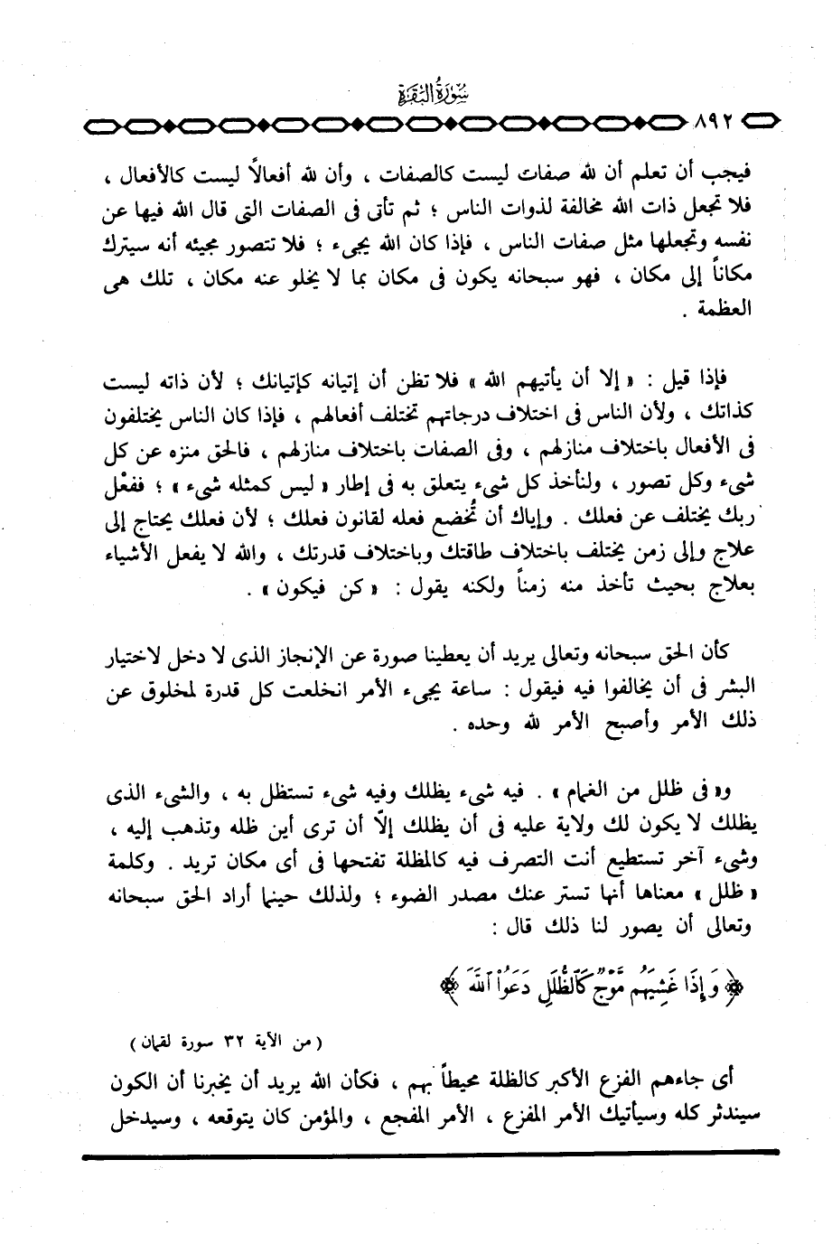 فإذا قيل: {إِلاَّ أَن يَأْتِيَهُمُ الله} فلا تظن أن إتيانه كإتيانك، لأن ذاته ليست كذاتك، ولأن الناس في اختلاف درجاتهم تختلف أفعالهم، فإذا كان الناس يختلفون في الأفعال باختلاف منازلهم، وفي الصفات باختلاف منازلهم، فالحق منزه عن كل شيء وكل تصور، ولنأخذ كل شيء يتعلق به في إطار {لَيْسَ كَمِثْلِهِ شَيْءٌ} ؛ ففعْل ربك يختلف عن فعلك. وإياك أن تُخضع فعله لقانون فعلك؛ لأن فعلك يحتاج إلى علاج وإلى زمن يختلف باختلاف طاقتك وباختلاف قدرتك، والله لا يفعل الأشياء بعلاج بحيث تأخذ منه زمناً ولكنه يقول: {كُنْ فَيَكُونُ} .
