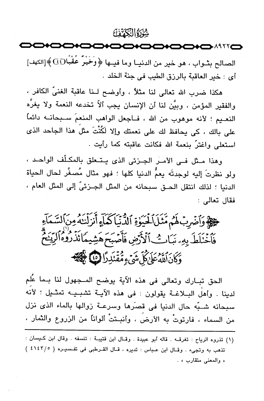 هكذا ضرب الله تعالى لنا مثلاً، وأوضح لنا عاقبة الغنيّ الكافر، والفقير المؤمن، وبيَّن لنا أن الإنسان يجب ألاّ تخدعه النعمة ولا يغره النعيم؛ لأنه موهوب من الله، فاجعل الواهب المنعِمَ سبحانه دائماً على بالك، كي يحافظ لك على نعمتك وإلا لَكُنْتَ مثل هذا الجاحد الذي استعلى واغترّ بنعمة الله فكانت عاقبته كما رأيت.