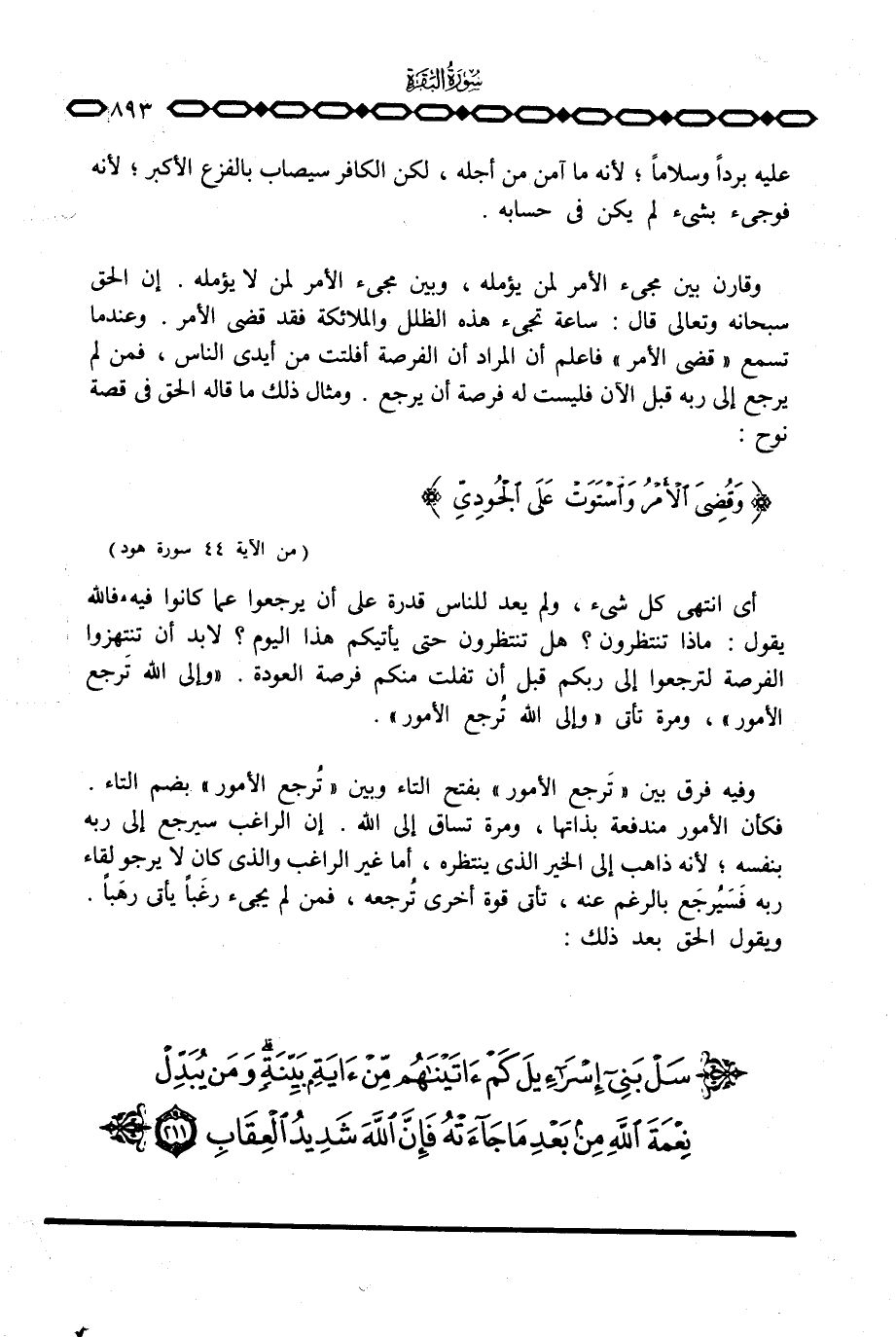 وفيه فرق بين «تَرجع الأمور» بفتح التاء وبين «تُرجع الأمور» بضم التاء. فكأن الأمور مندفعة بذاتها، ومرة تساق إلى الله. إن الراغب سيرجع إلى ربه بنفسه؛ لأنه ذاهب إلى الخير الذي ينتظره، أما غير الراغب والذي كان لا يرجو لقاء ربه فَسَيُرجَع بالرغم عنه، تأتي قوة أخرى تُرجعه، فمن لم يجيء رغَباً يأتي رهَباً.