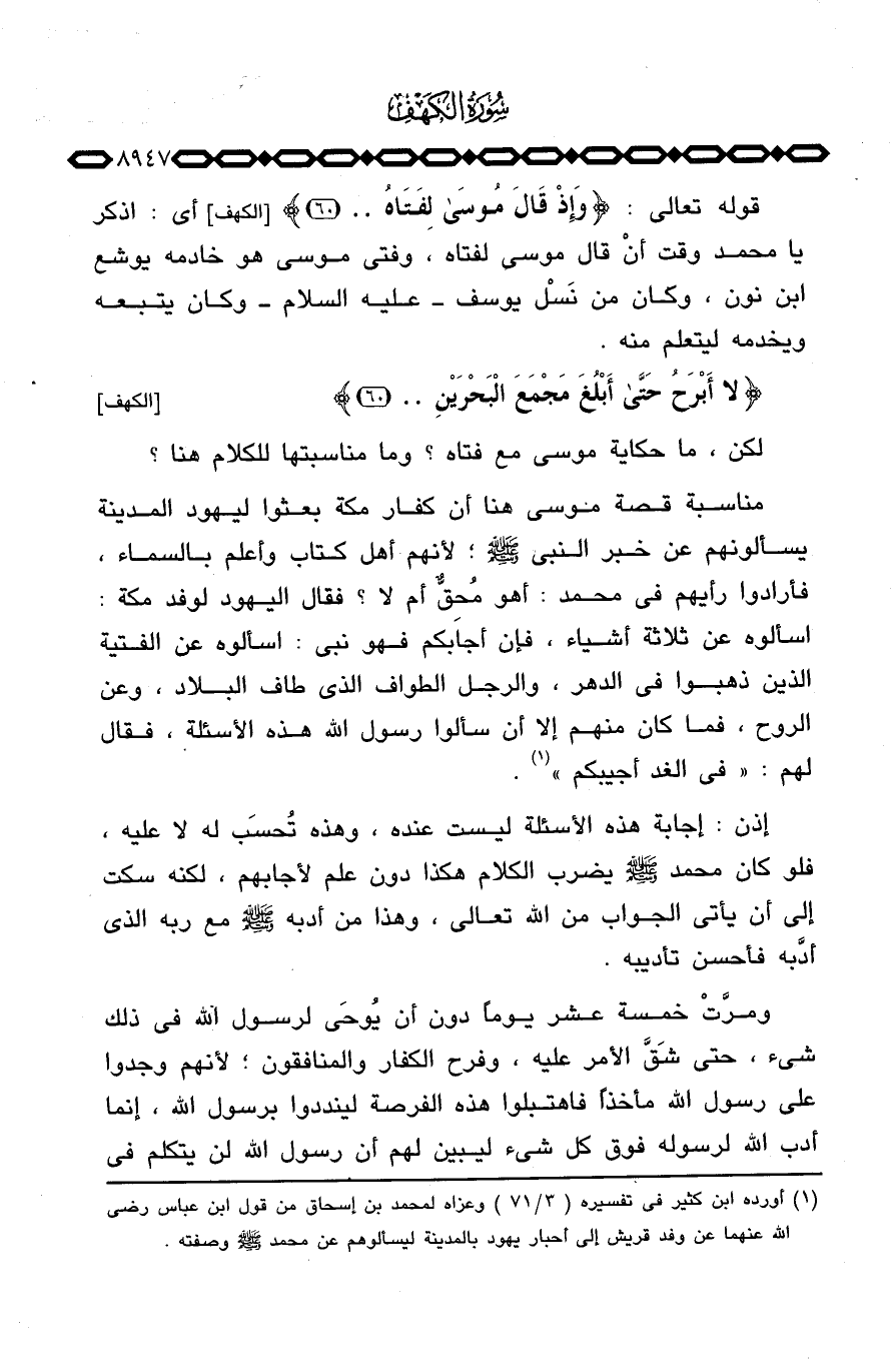مناسبة قصة موسى هنا أن كفار مكة بعثوا ليهود المدينة يسألونهم عن خبر النبي صَلَّى اللَّهُ عَلَيْهِ وَسَلَّم َ؛ لأنهم أهل كتاب وأعلم بالسماء، فأرادوا رأيهم في محمد: أهو مُحِقٌّ أم لا؟ فقال اليهود لوفد مكة: اسألوه عن ثلاثة أشياء، فإن أجابكم فهو نبي: اسألوه عن الفتية الذين ذهبوا في الدهر، والرجل الطواف الذي طاف البلاد، وعن الروح، فما كان منهم إلا أن سألوا رسول الله هذه الأسئلة، فقال لهم: «في الغد أجيبكم» .