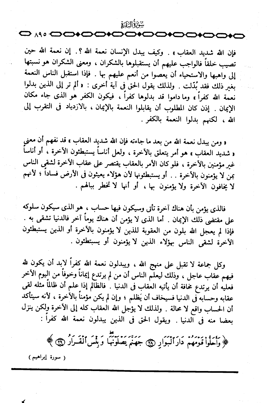فَإِنَّ الله شَدِيدُ العقاب} . وكيف يبدل الإنسان نعمة الله؟ . إن نعمة الله حين تصيب خلقاً فالواجب عليهم أن يستقبلوها بالشكران، ومعنى الشكران هو نسبتها إلى واهبها والاستحياء أن يعصوا من أنعم عليهم بها. فإذا استقبل الناس النعمة بغير ذلك فقد بُدِلَت. ولذلك يقول الحق في آية أخرى: {أَلَمْ تَرَ إِلَى الذين بَدَّلُواْ نِعْمَةَ الله كُفْراً} وما داموا قد بدلوها كفراً، فيكون الكفر هو الذي جاء مكان الإيمان.