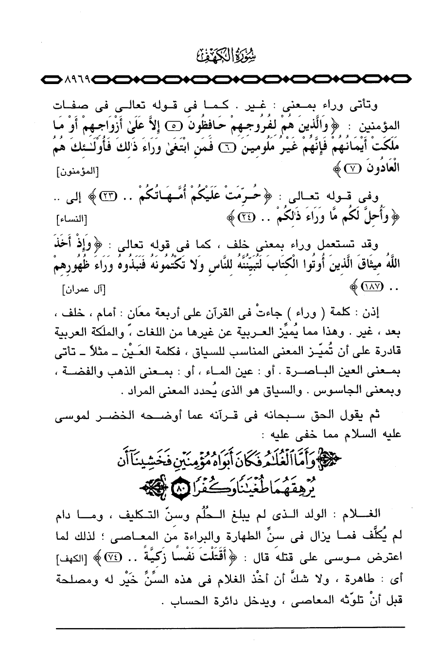 إذن: كلمة {وَرَاءَ} جاءتْ في القرآن على أربعة معَانٍ: أمام، خلف، بعد، غير. وهذا مما يُميِّز العربية عن غيرها من اللغات، والملَكة العربية قادرة على أن تُميّز المعنى المناسب للسياق، فكلمة العَيْن مثلاً تأتي بمعنى العين الباصرة. أو: عين الماء، أو: بمعنى الذهب والفضة، وبمعنى الجاسوس. والسياق هو الذي يُحدد المعنى المراد.