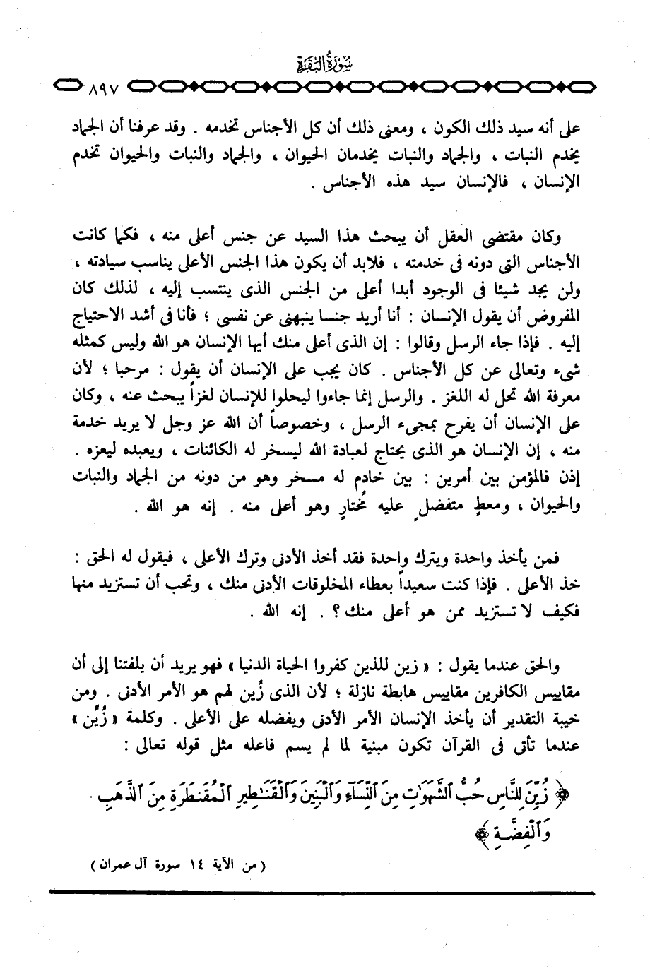 وكان مقتضى العقل أن يبحث هذا السيد عن جنس أعلى منه، فكما كانت الأجناس التي دونه في خدمته، فلابد أن يكون هذا الجنس الأعلى يناسب سيادته، ولن يجد شيئا في الوجود أبدا أعلى من الجنس الذي ينتسب إليه، لذلك كان المفروض أن يقول الإنسان: أنا أريد جنسا ينبهني عن نفسي؛ فأنا في أشد الاحتياج إليه. فإذا جاء الرسل وقالوا: إن الذي أعلى منك أيها الإنسان هو الله وليس كمثله شيء وتعالى عن كل الأجناس. كان يجب على الإنسان أن يقول: مرحبا؛ لأن معرفة الله تحل له اللغز. والرسل إنما جاءوا ليحلوا للإنسان لغزاً يبحث عنه، وكان على الإنسان أن يفرح بمجيء الرسل، وخصوصاً أن الله عَزَّ وَجَلَّ لا يريد خدمة منه، إن الإنسان هو الذي يحتاج لعبادة الله ليسخر له الكائنات، ويعبده ليعزه. إذن فالمؤمن بين أمرين: بين خادم له مسخر وهو من دونه من الجهاد والنبات والحيوان، ومعطٍ متفضلٍ عليه مُختارٍ وهو أعلى منه. إنه هو الله.