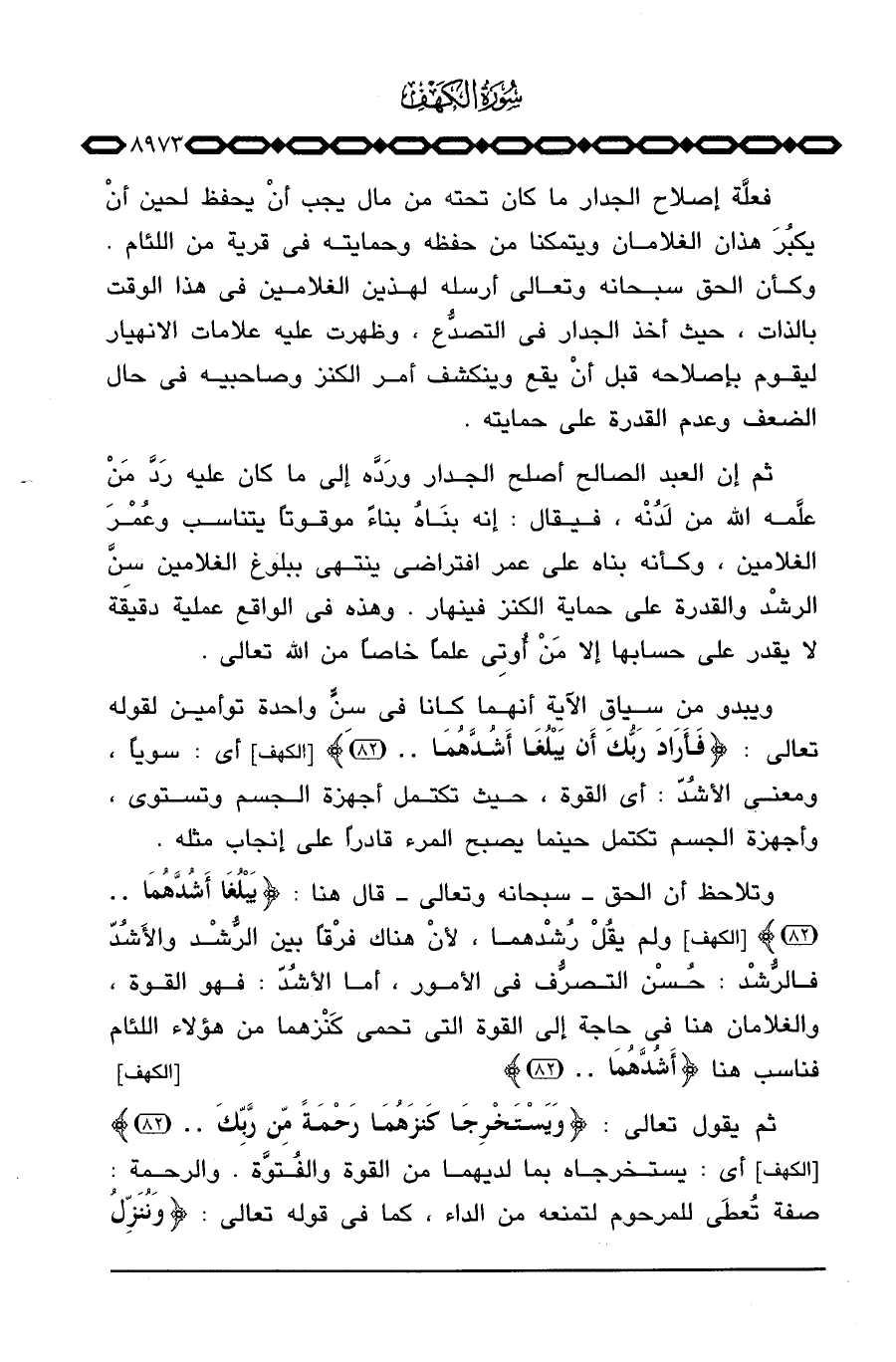 وتلاحظ أن الحق سبحانه وتعالى قال هنا: {يَبْلُغَآ أَشُدَّهُمَا. .} [الكهف: 82] ولم يقُلْ رُشْدهما، لأنْ هناك فرْقاً بين الرُّشْد والأَشُدّ فالرُّشْد: حُسْن التصرُّف في الأمور، أما الأشُدَّ: فهو القوة، والغلامان هنا في حاجة إلى القوة التي تحمي كَنْزهما من هؤلاء اللئام فناسب هنا {أَشُدَّهُمَا. .} [الكهف: 82]