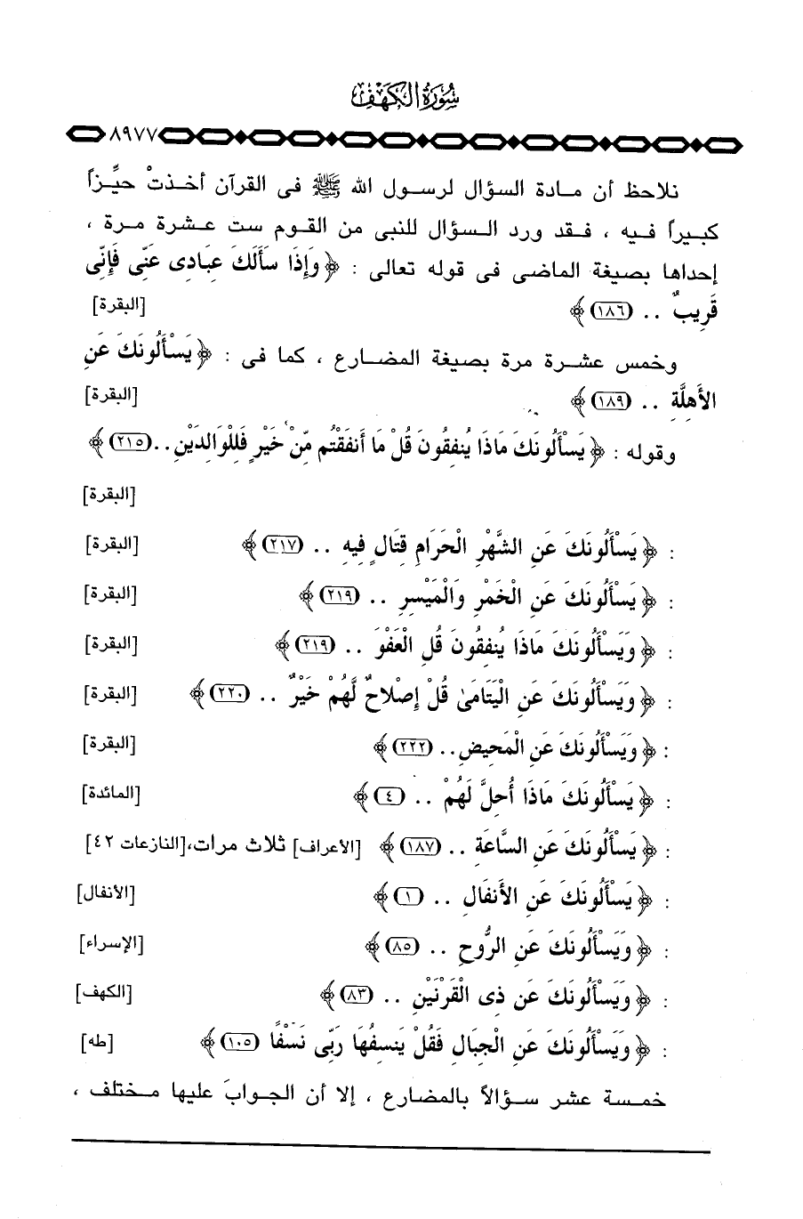 وقوله: {يَسْأَلُونَكَ مَاذَا يُنْفِقُونَ قُلْ مَآ أَنْفَقْتُمْ مِّنْ خَيْرٍ فَلِلْوَالِدَيْنِ. .} [البقرة: 215] {يَسْأَلُونَكَ عَنِ الشهر الحرام قِتَالٍ فِيهِ. .} [البقرة: 217] {يَسْأَلُونَكَ عَنِ الخمر والميسر. .} [البقرة: 219] {وَيَسْأَلُونَكَ مَاذَا يُنفِقُونَ قُلِ العفو} [البقرة: 219] {وَيَسْأَلُونَكَ عَنِ اليتامى قُلْ إِصْلاَحٌ لَّهُمْ خَيْرٌ. .} [البقرة: 220] {وَيَسْأَلُونَكَ عَنِ المحيض. .} [البقرة: 222] {يَسْأَلُونَكَ مَاذَآ أُحِلَّ لَهُمْ. .} [المائدة: 4] {يَسْأَلُونَكَ عَنِ الساعة} [الأعراف: 187] ثلاث مرات، [النازعات: 42] {يَسْأَلُونَكَ عَنِ الأنفال. .} [الأنفال: 1] {وَيَسْأَلُونَكَ عَنِ الروح. .} [الإسراء: 85]